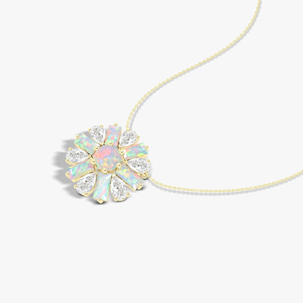 White OpalGOODSTONE JEWELS Round Charm Pendant Necklace, a stunning fusion of classic design and natural beauty. Expertly crafted in 925 sterling silver and finished with a luxurious yellow gold plating, this necklace is the perfect accessory to enhance any look, from casual chic to elegant evening wear. At the heart of this exquisite piece is a 2.0-carat natural white opal, renowned for its captivating play of colors. The unique gemstone is complemented by a 5mm hexagon-cut center stone and six 5x3mm baguette-cut accents, creating a mesmerizing effect that draws the eye and adds a sophisticated sparkle. Designed with comfort and versatility in mind, the necklace features a 16-inch cable chain with a 2-inch extender, allowing for a perfect fit with any neckline. Despite its bold appearance, the pendant is lightweight at just 3.80 grams, ensuring effortless all-day wear.