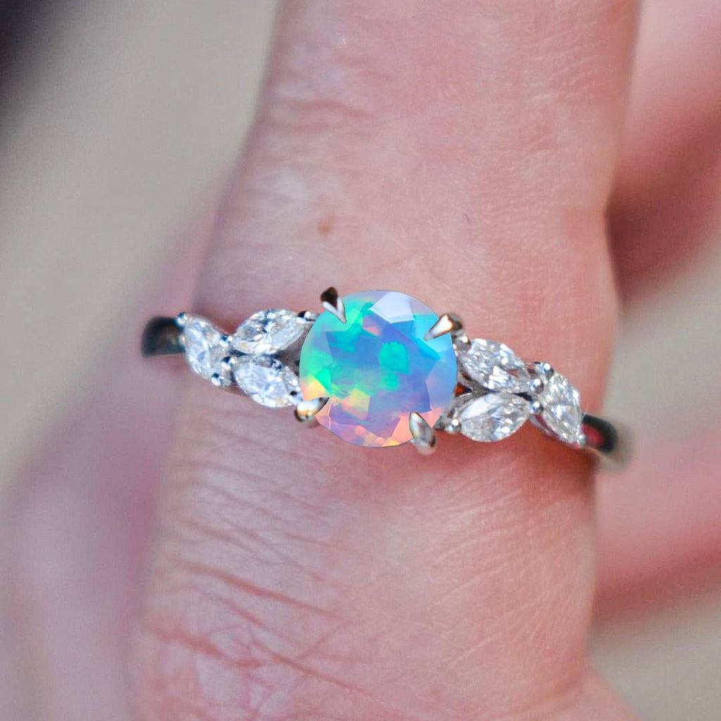 White OpalNatural White Opal 925 Sterling Silver Statement Ring, beautifully crafted for women who appreciate unique and meaningful jewelry. This captivating ring features a 6 mm round natural White Opal (0.8 carat), known for its vibrant play of colors that change beautifully with every movement. Each gemstone is one-of-a-kind, ensuring your ring is as unique as the person wearing it. Expertly handmade with 925 sterling silver and coated in luxurious yellow gold fill, this piece merges durability with sophisticated style. The smooth band offers exceptional comfort, making it perfect for everyday elegance or special occasions.