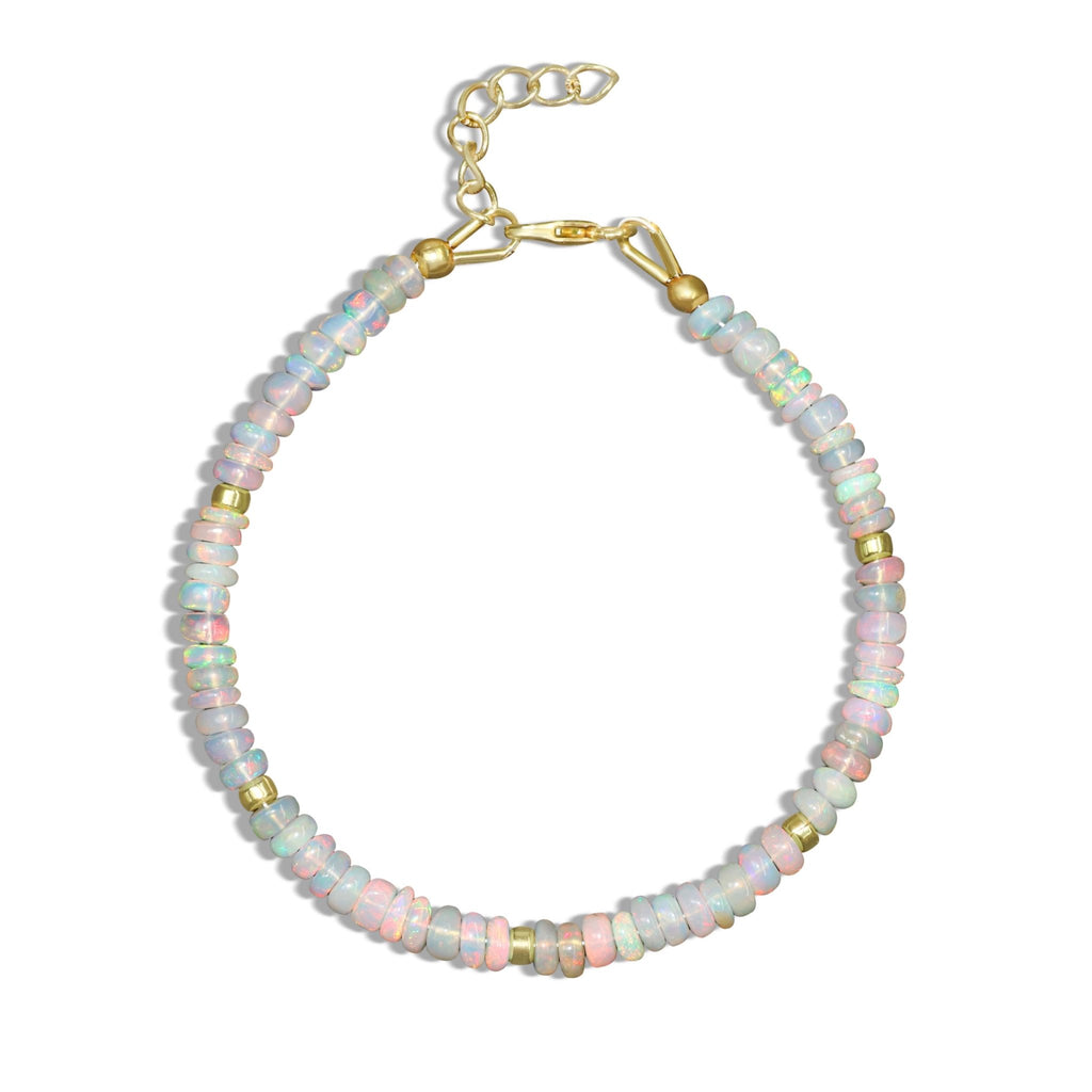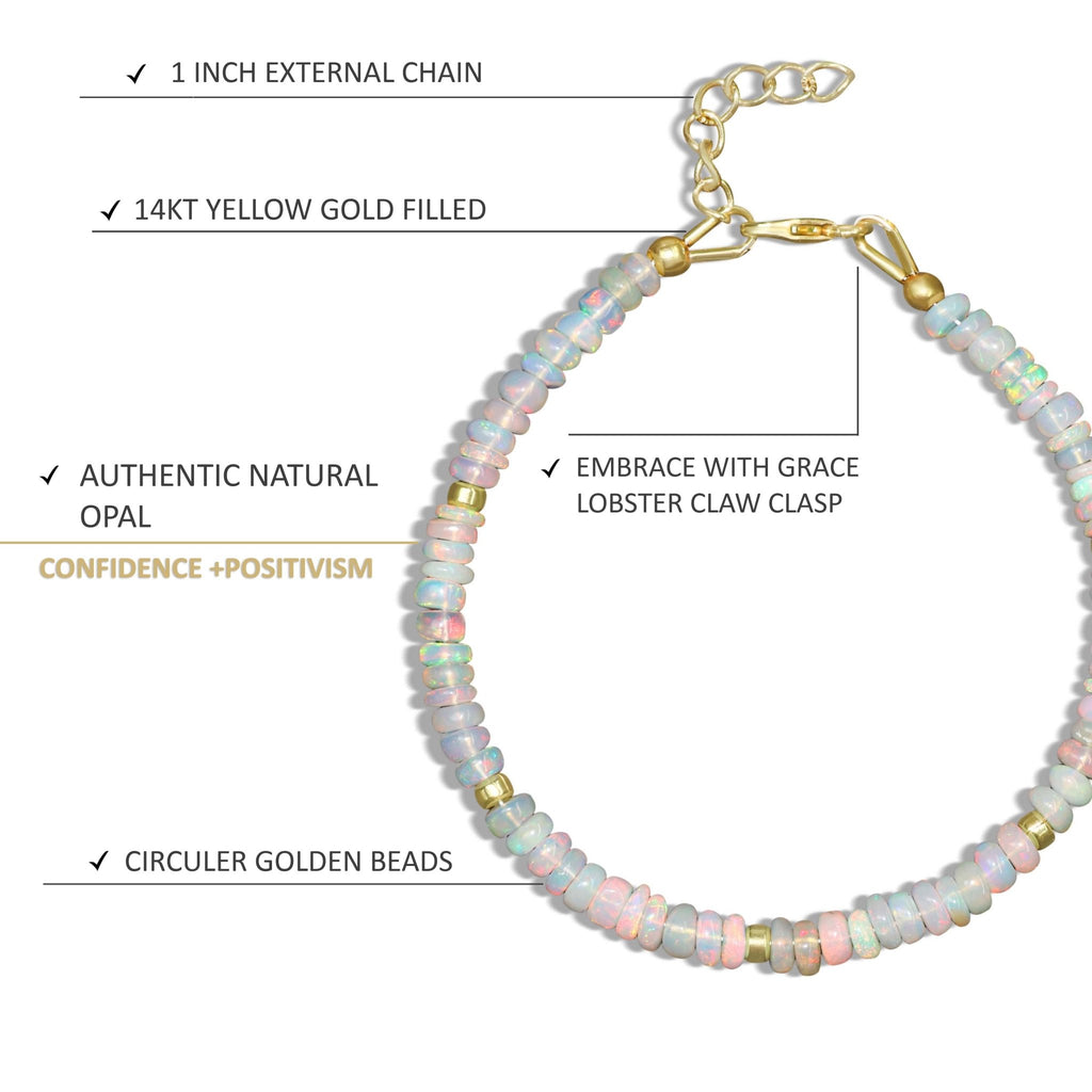 White OpalSeparator Bead Strand Rondelle Bracelet for Women, a handcrafted piece that blends natural beauty with refined design. Adorned with genuine white Opal beads, this bracelet adds a radiant splash of color and sophistication to any look. Made with Yellow Gold-Filled accents and 925 Sterling Silver, this bracelet is built for durability and long-lasting shine. The sleek rondelle bead design creates a graceful silhouette, while the 1-inch extension chain and secure lobster claw clasp ensure a comfortable and adjustable fit for any wrist.