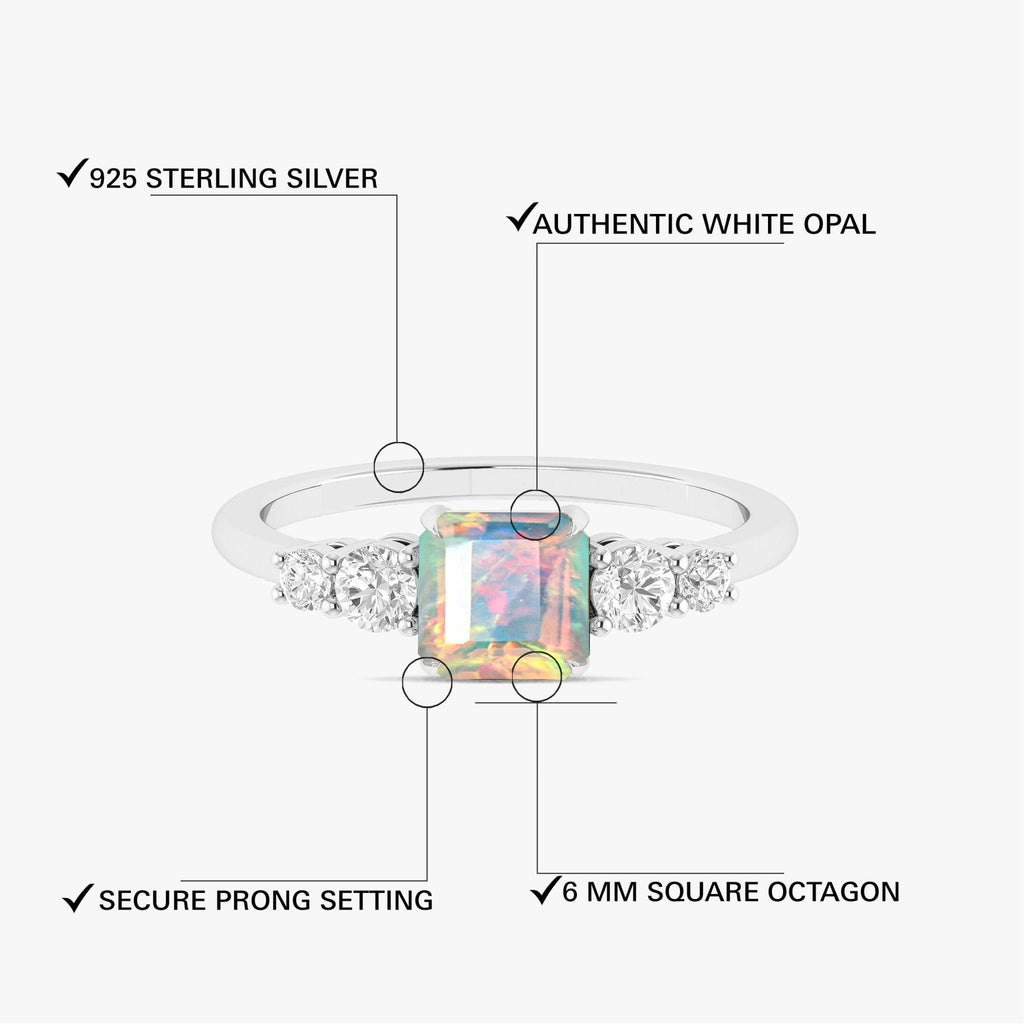 White OpalNatural White Opal 925 Sterling Silver Statement Ring a breathtaking piece designed for women who appreciate beauty, quality, and sophistication. At the heart of this ring lies a stunning 6MM square-shaped natural White Opal, known for its mesmerizing play-of-color that shimmers in hues of green, blue, and red as it catches the light. Each gemstone is hand-selected for its brilliance and uniqueness, making every ring truly one of a kind. Crafted from hypoallergenic 925 sterling silver, the band offers a smooth, comfortable fit while ensuring lasting durability and shine. Inspired by Art Deco design, this ring combines vintage charm with modern sophistication.
