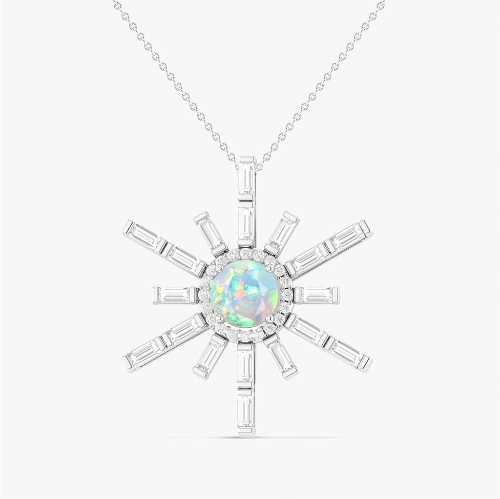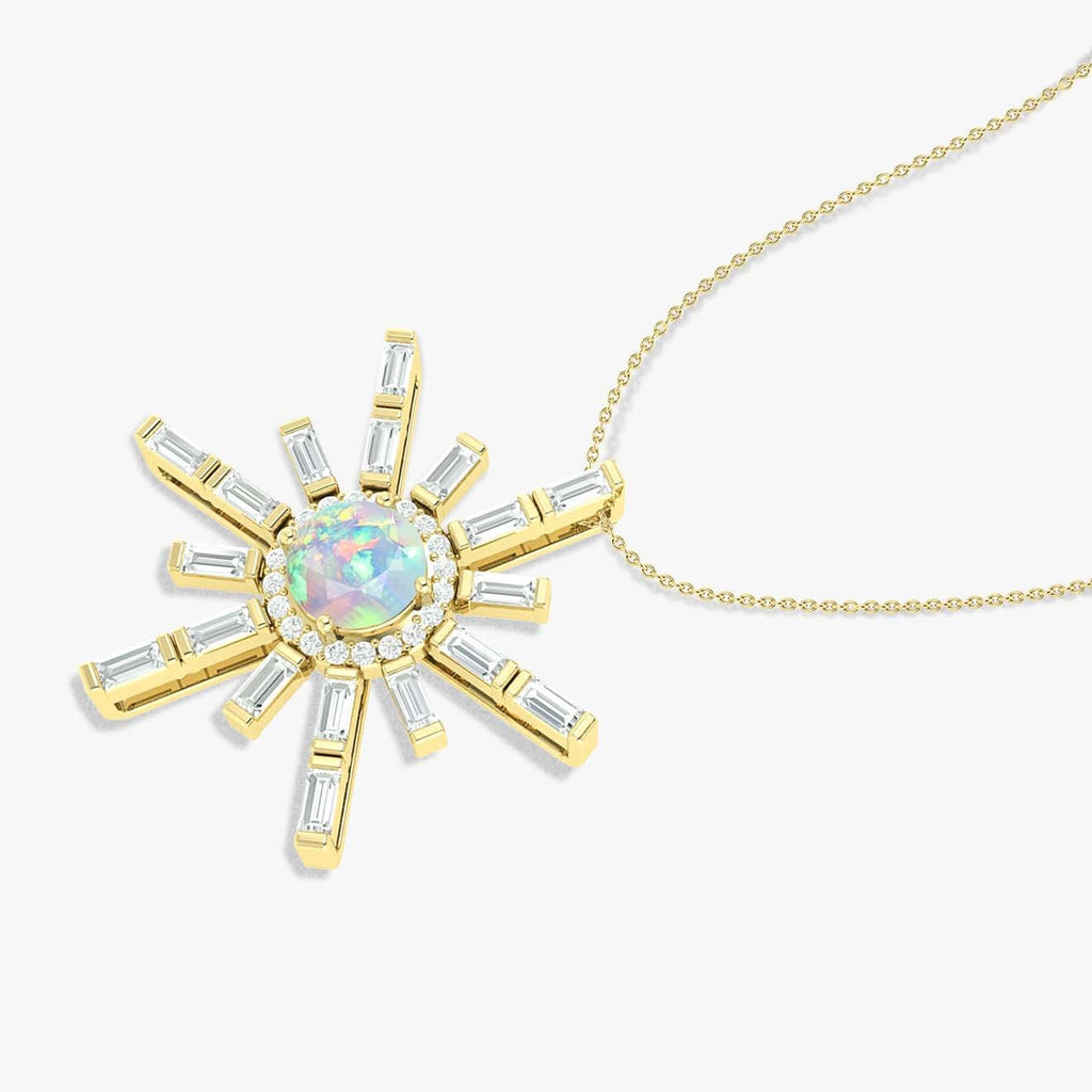 White OpalGOODSTONE JEWELS Natural Opal Sun Charm Pendant Necklace. This exquisite piece features a stunning sun charm adorned with vibrant natural gemstones opal in 925 sterling silver with a luxurious yellow gold-filled finish. It’s the perfect blend of elegance and celestial inspiration, designed to complement any outfit. The necklace is not just beautiful but also versatile, offering an adjustable 16-inch cable chain with a 2-inch extender. This ensures a perfect fit for a variety of necklines and allows for layering with other jewelry pieces. Whether you're dressing up for a special occasion or adding a touch of sparkle to your daily attire, this necklace will enhance your look.