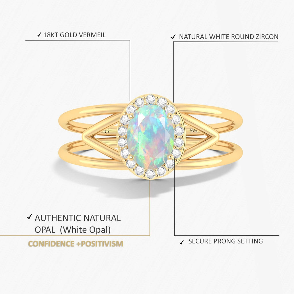 White OpalNatural White Opal Stackable Halo Ring for Women, expertly crafted in 925 Sterling Silver with a radiant yellow gold filled finish. At the center lies a stunning 7x5 mm oval faceted White opal a gemstone revered for its mystical beauty and protective energy. This ring’s evil eye design is more than just fashionable, it’s a meaningful symbol believed to ward off negativity and bring balance. Made with high-quality sterling silver, this hypoallergenic, tarnish-resistant ring is built to last while offering unmatched comfort. Whether it’s worn as a promise ring, engagement ring, or anniversary gift, this eye-catching piece makes a powerful statement.