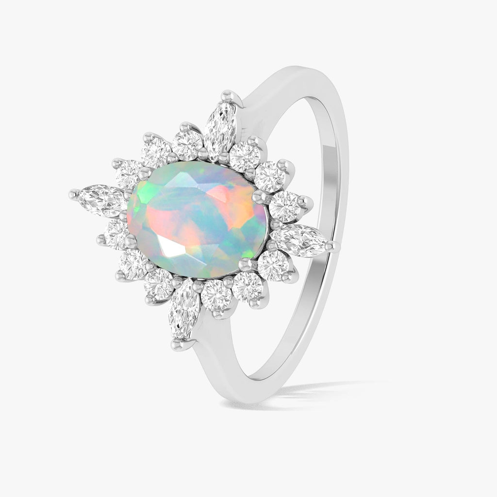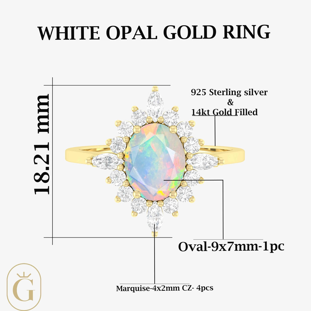 White OpalNatural White Opal 925 Sterling Silver Halo Ring featuring a vibrant 9x7 mm oval-cut natural White Opal, this ring captivates with its fiery color play and unique charm, making it the perfect Halo piece for any special occasion or everyday luxury. Crafted with premium 925 sterling silver, the band is hypoallergenic and built to last, offering both durability and refined beauty. Whether you're celebrating an anniversary, birthday, wedding, or Valentine’s Day, this exquisite White Opal ring makes an unforgettable gift for the woman you love. It's 1.0 carat weight and elegant design reflect both sentiment and style, making it a treasured keepsake she’ll cherish forever.