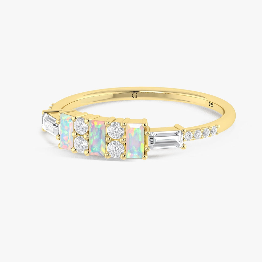 White OpalNatural White Opal Ring, thoughtfully crafted for the modern woman who appreciates both beauty and symbolism. Featuring genuine 4x2 mm baguette-cut White opals, this ring boasts a total of 1.25 carats of natural brilliance. Each opal sparkles with a mesmerizing play of color, making it a captivating centerpiece for any jewelry lover. Expertly crafted in premium 925 sterling silver for an opulent finish, this ring promises durability, comfort, and enduring shine. Whether you're shopping for a birthday, milestone, or to express your love, this handcrafted statement ring is the perfect choice.