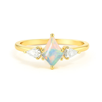 Add a touch of mystique and elegance to your jewelry collection with this dazzling three-stone ring, beautifully crafted in 925 Sterling Silver with Yellow Gold Plating. At its heart lies a mesmerizing 8x6mm kite-shaped natural White Opal, known for its stunning play-of-color and deep, iridescent tones. Flanked by two shimmering 5x3mm kite-cut White Cubic Zirconia stones, this ring symbolizes the past, present, and future, making it a perfect expression of enduring love, cherished memories, or meaningful milestones. Together, the gemstones weigh approximately 1.5 carats, with each one faceted cut to enhance brilliance and detail. With a metal weight of 2.20 grams, this ring is lightweight yet enduring, offering comfort and style in equal measure. The dramatic silhouette and radiant gemstone contrast make this three-stone design a standout piece for both everyday wear and special occasions.
