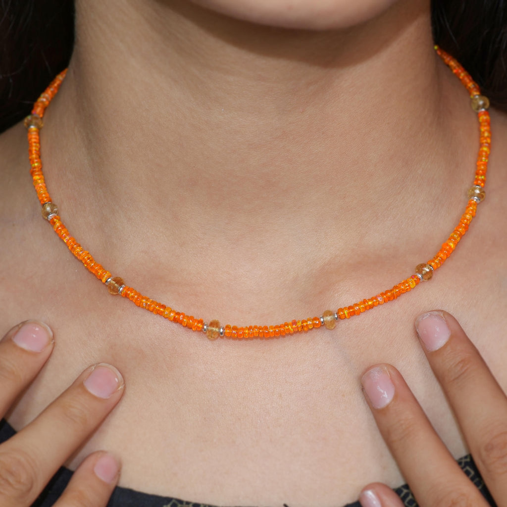 This Natural Orange fire Ethiopian opal with citrine beaded necklace is a stunning piece of jewelry that combines the unique and vibrant colors of opal with the warm and bright tones of citrine. Made from natural, high-quality materials, this necklace is sure to catch the eye and add a touch of elegance to any outfit. Add this beautiful necklace to your collection today.