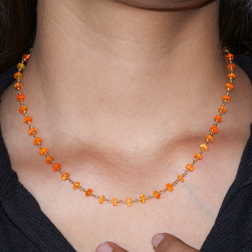 This expertly crafted Orange Fire Ethiopian Opal necklace features a stunning wire wrap design and delicate chain beads. With its unique fiery opal stones, this necklace is sure to add a touch of elegance and sophistication to any outfit. Embrace the beauty and power of opals with this exquisite piece.
