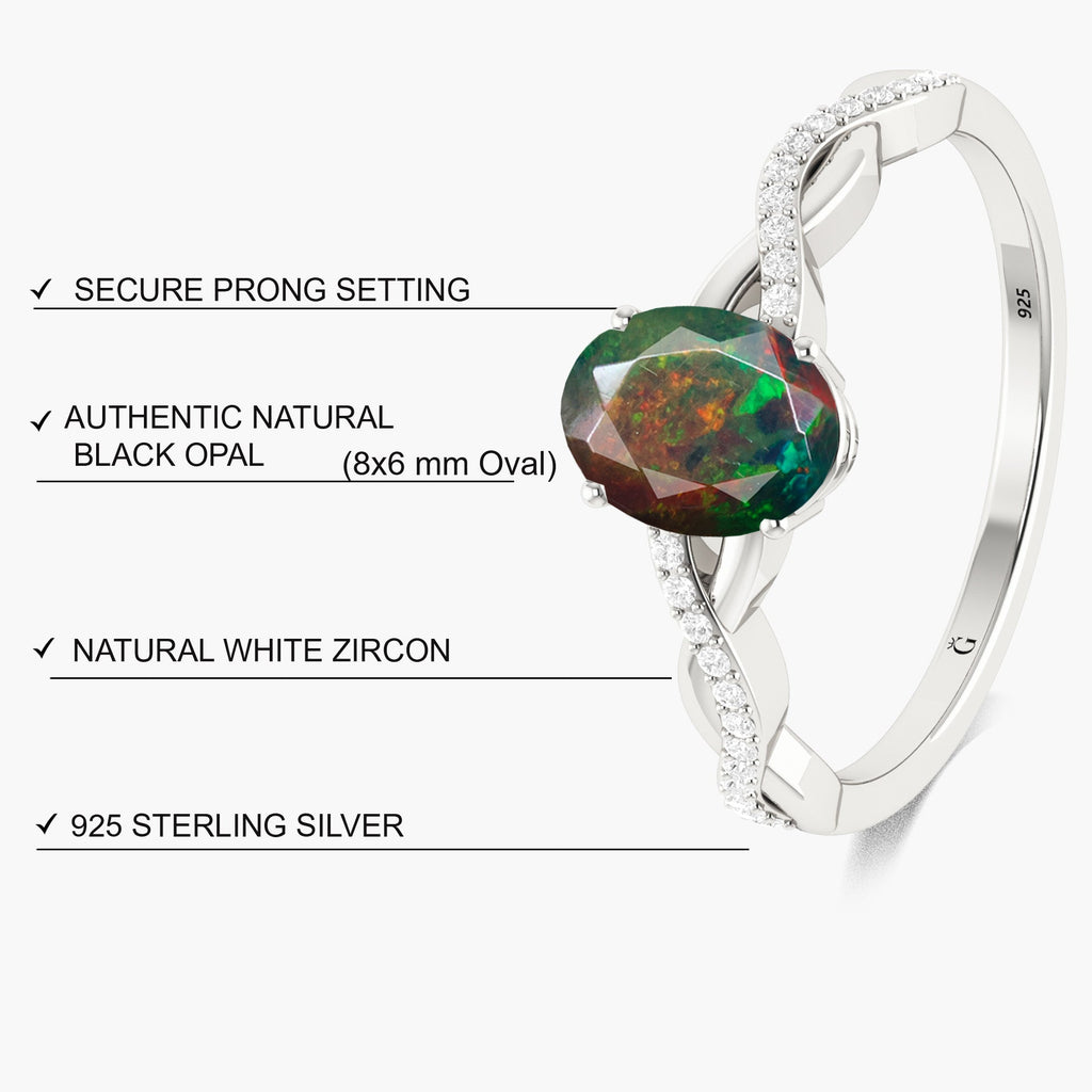 Black OpalNatural Black Opal 925 Sterling Silver Crossover Statement Ring for Women for a luxurious touch. At its heart lies a captivating 8x6 mm oval faceted Black Opal, showcasing a mesmerizing play of color that makes this ring a standout piece for any jewelry lover. Expertly crafted from hypoallergenic 925 sterling silver, this opal ring ensures lasting brilliance and comfort for sensitive skin, perfect for daily wear or special occasions. Whether you're celebrating a wedding, anniversary, birthday, or a romantic promise, this elegant opal ring is a heartfelt gift for the special woman in your life, be it your wife, girlfriend, or mother.