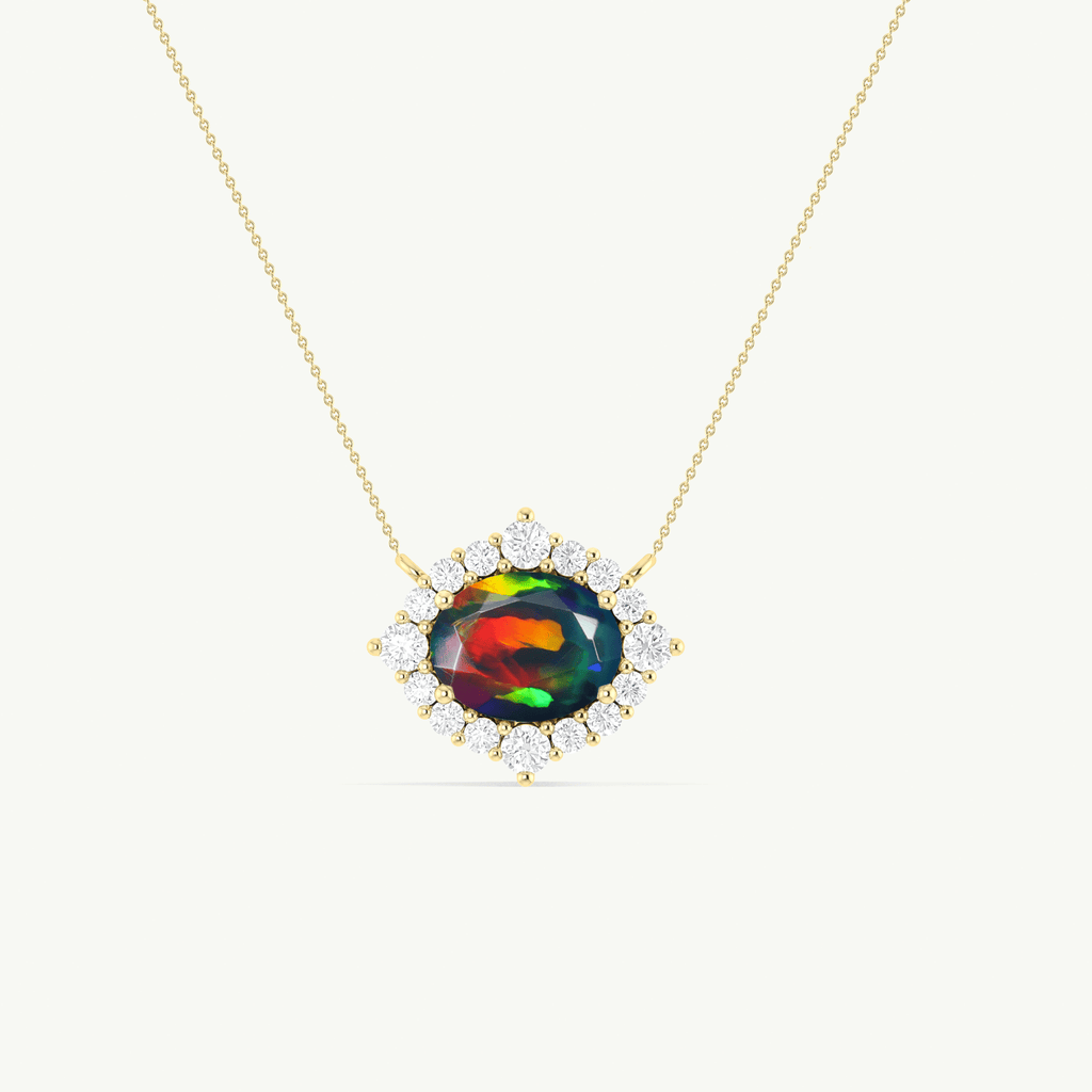 Black OpalElevate your jewelry collection with this enchanting Natural Opal Gemstone Halo Pendant Necklace by GOODSTONE JEWELS. Handcrafted in 925 Sterling Silver with Yellow Gold Fill, this piece showcases a stunning 9x7 mm oval-cut natural Opal (1.2 carat). This stone brings not only timeless elegance but also symbolic meaning Opal inspires creativity and ignites passion. Whether you're dressing up for a special occasion or adding a spiritual touch to your daily style, this necklace makes a lasting impression. The 13.5 x 15.4 mm charm pendant hangs gracefully from a 16-inch cable chain with a 2-inch extender, secured by a durable lobster clasp for adjustable comfort and a perfect fit for all necklines.