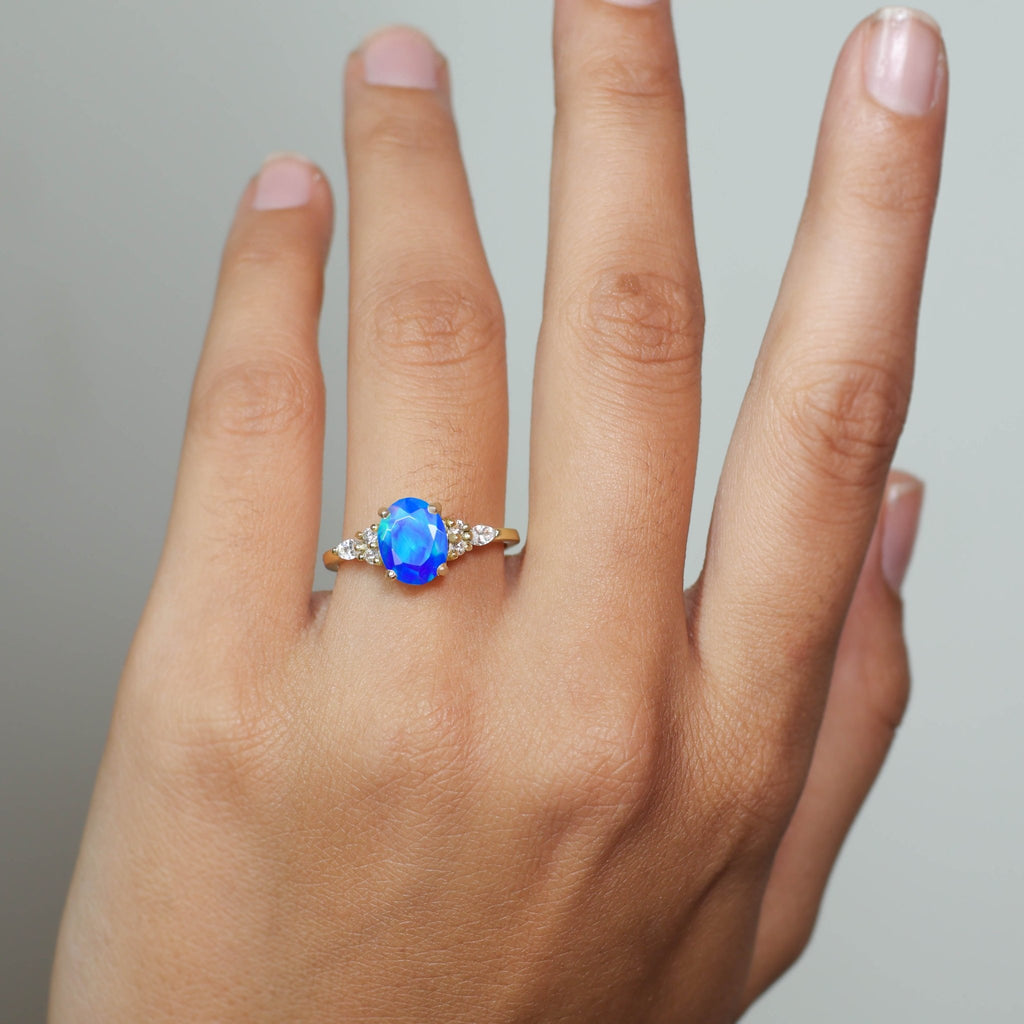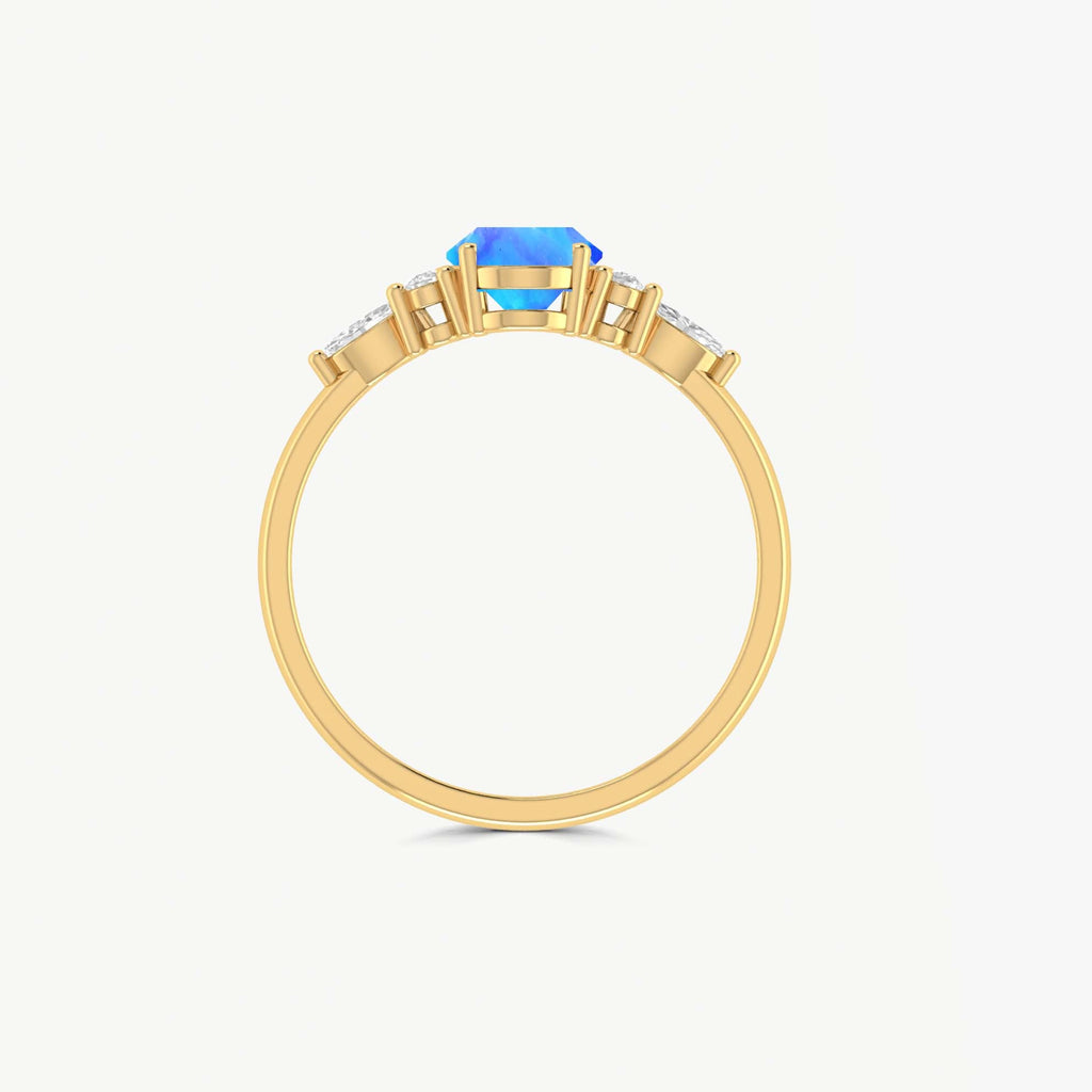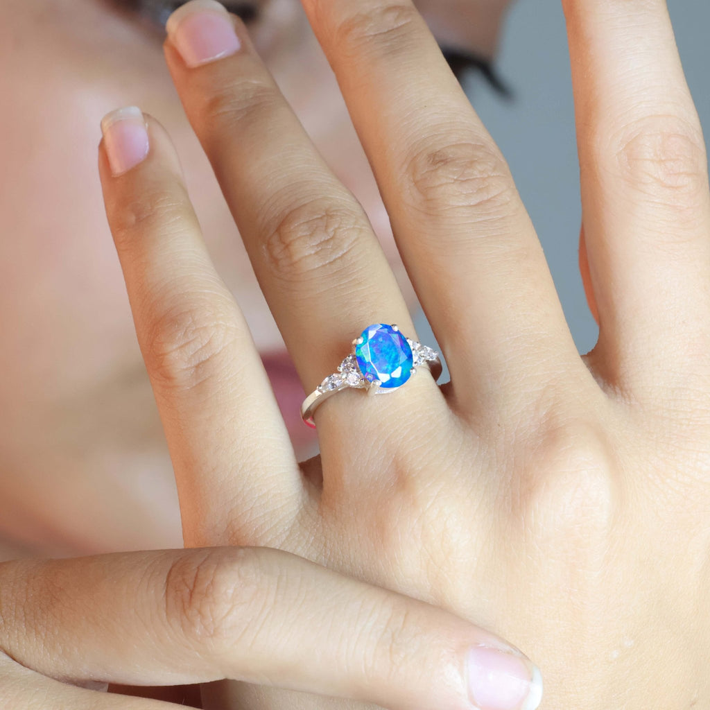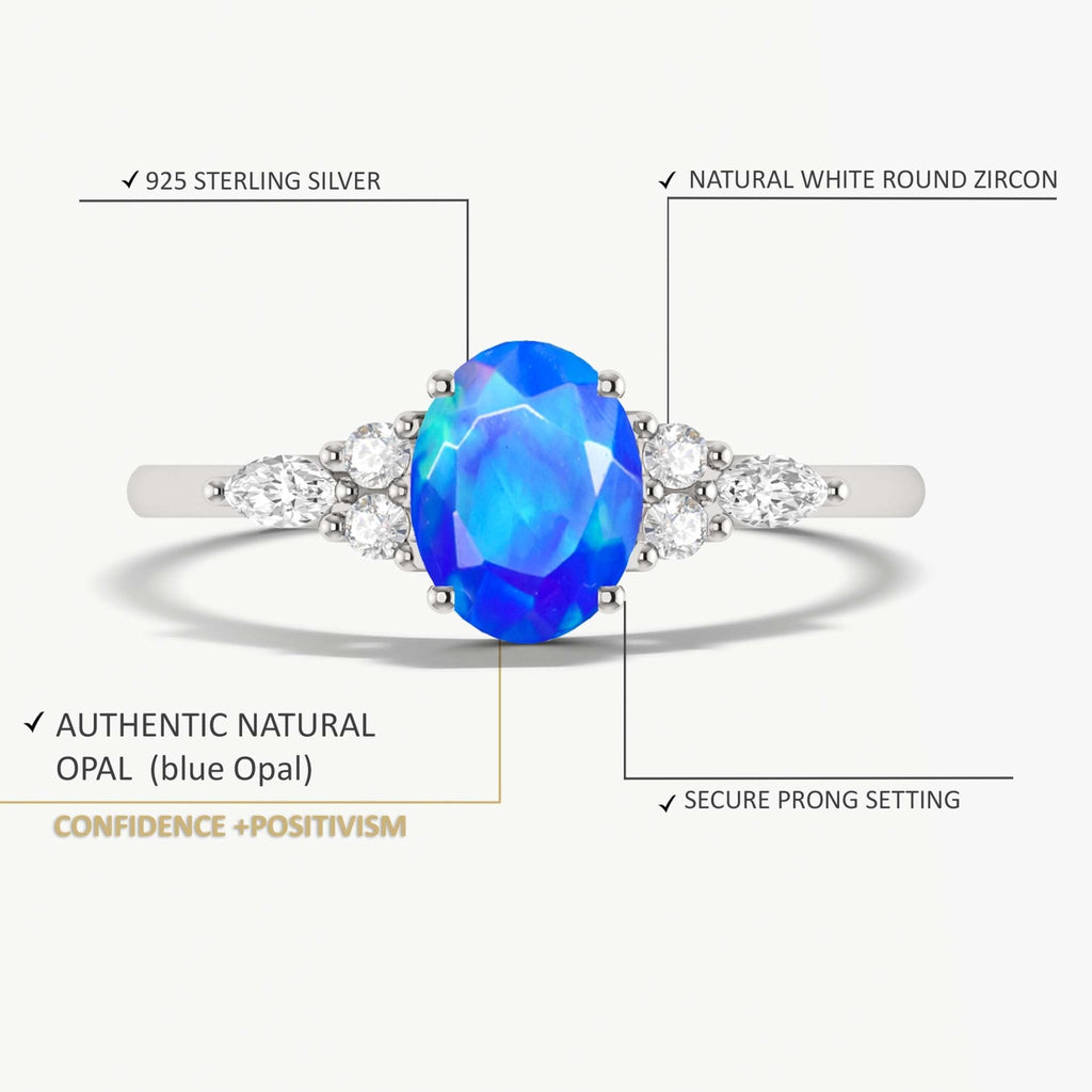 Blue OpalNatural Blue Opal 925 Sterling Silver Solitaire with Accents Ring for Women, a luxurious piece designed to make every moment unforgettable. This exquisite ring features a genuine natural Blue opal, cut in a graceful 8x6mm oval shape and weighing approximately 0.9 carats. The gemstone is known for its mesmerizing play-of-color, making each piece truly unique. Set in solid 925 sterling silver with a durable yellow gold-filled finish, this ring blends classic beauty with modern flair. The smooth, polished band is hypoallergenic, nickel-free, and ideal for sensitive skin, ensuring lasting comfort and brilliance. Whether you're dressing up for a wedding, anniversary, or simply adding a touch of glamour to your everyday look, this Blue opal Solitaire with Accents ring is your go-to accessory.