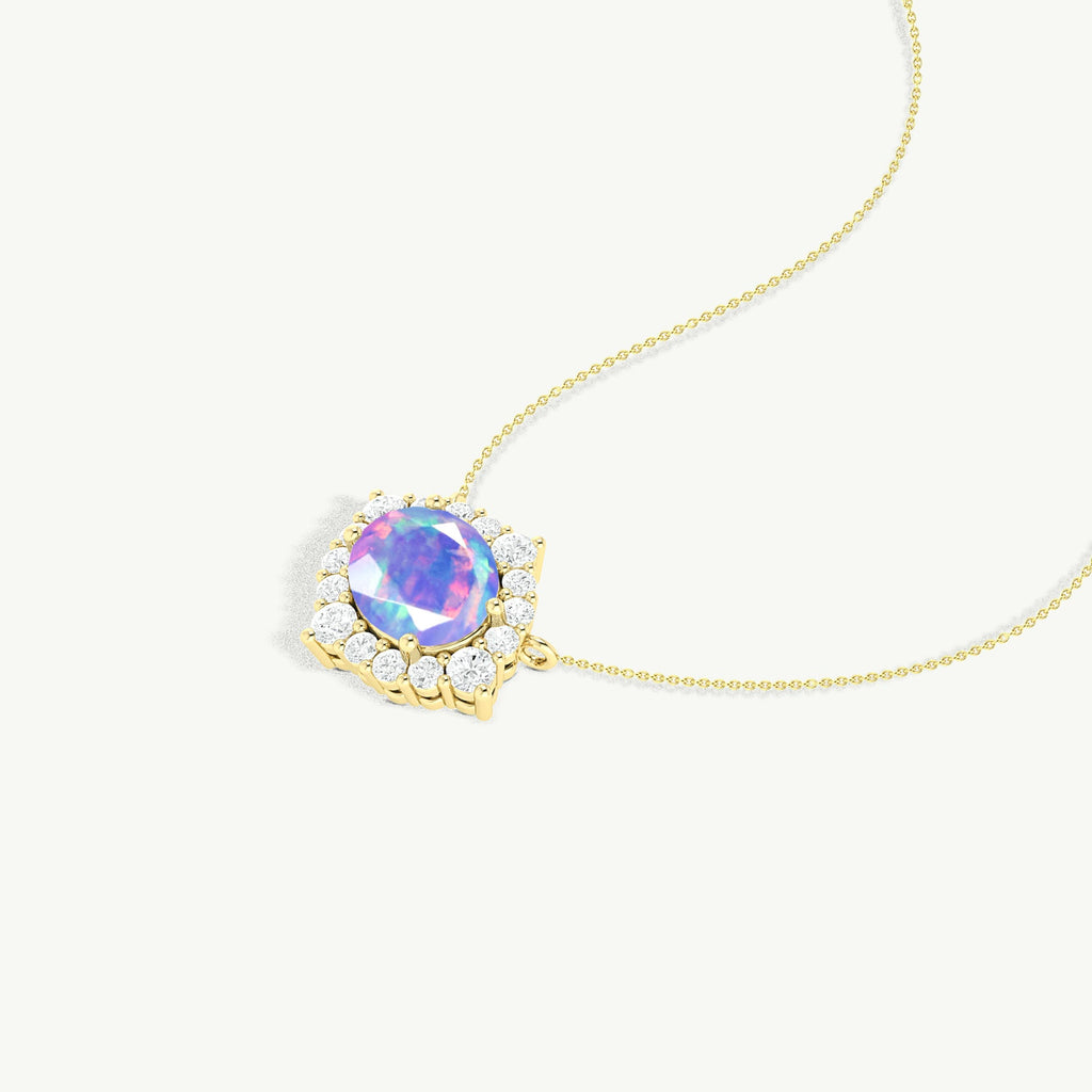 Lavender OpalElevate your jewelry collection with this enchanting Natural Opal Gemstone Halo Pendant Necklace by GOODSTONE JEWELS. Handcrafted in 925 Sterling Silver with Yellow Gold Fill, this piece showcases a stunning 9x7 mm oval-cut natural Opal (1.2 carat). This stone brings not only timeless elegance but also symbolic meaning Opal inspires creativity and ignites passion. Whether you're dressing up for a special occasion or adding a spiritual touch to your daily style, this necklace makes a lasting impression. The 13.5 x 15.4 mm charm pendant hangs gracefully from a 16-inch cable chain with a 2-inch extender, secured by a durable lobster clasp for adjustable comfort and a perfect fit for all necklines.