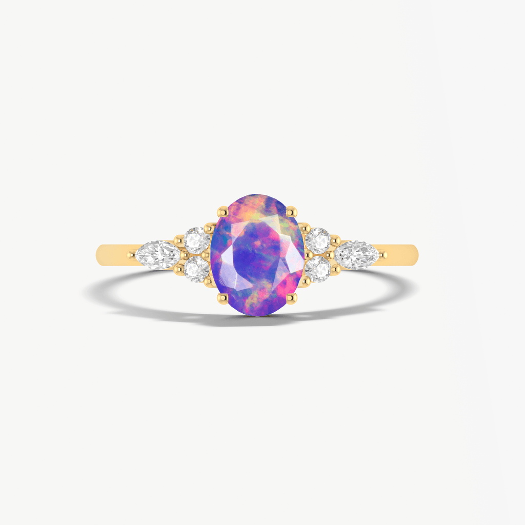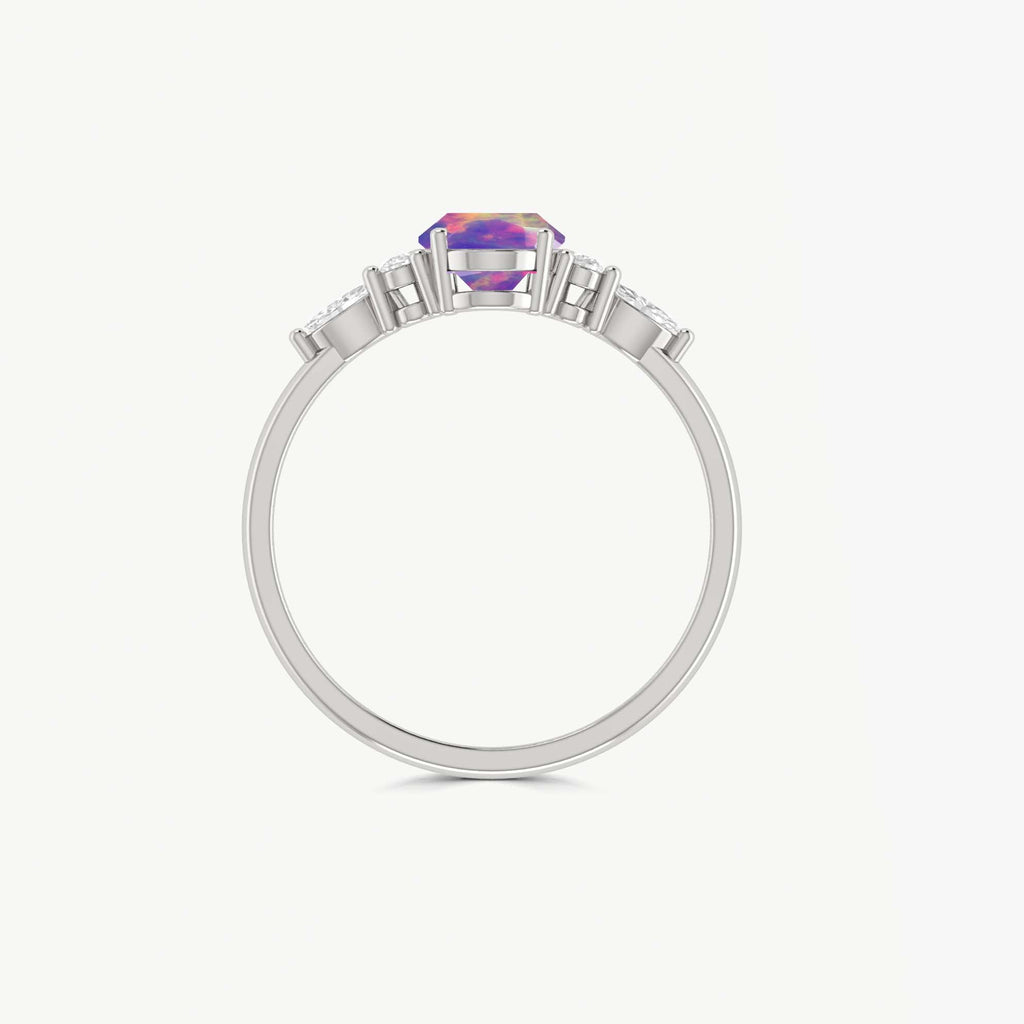 Lavender OpalNatural Lavender Opal 925 Sterling Silver Solitaire with Accents Ring for Women, a luxurious piece designed to make every moment unforgettable. This exquisite ring features a genuine natural Lavender Opal, cut in a graceful 8x6mm oval shape and weighing approximately 0.9 carats. The gemstone is known for its mesmerizing play-of-color, making each piece truly unique. Set in solid 925 sterling silver, this ring blends classic beauty with modern flair. The smooth, polished band is hypoallergenic, nickel-free, and ideal for sensitive skin, ensuring lasting comfort and brilliance. Whether you're dressing up for a wedding, anniversary, or simply adding a touch of glamour to your everyday look, this Lavender Opal Solitaire with Accents ring is your go-to accessory.