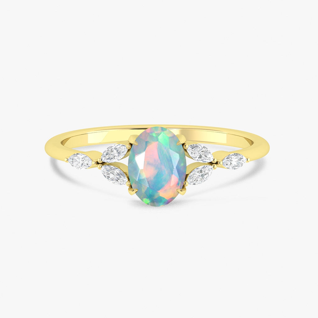 White OpalAt the heart of this piece is a vivid 7x5 mm oval White Opal, a gemstone known for its brilliant play-of-color and spiritual symbolism. With its deep hues and dynamic fire, this White Opal is more than a stone; it's a story. This gorgeous ring is crafted from genuine 925 sterling silver, richly plated in yellow gold for a warm, luxurious finish. Hypoallergenic and nickel-free, it’s safe for sensitive skin and built for both comfort and longevity. Whether you're searching for a unique birthstone ring, a statement piece for your collection, or a meaningful gift for her, this handcrafted ring delivers beauty, sentiment, and sophistication in one elegant design.