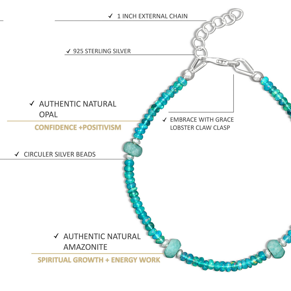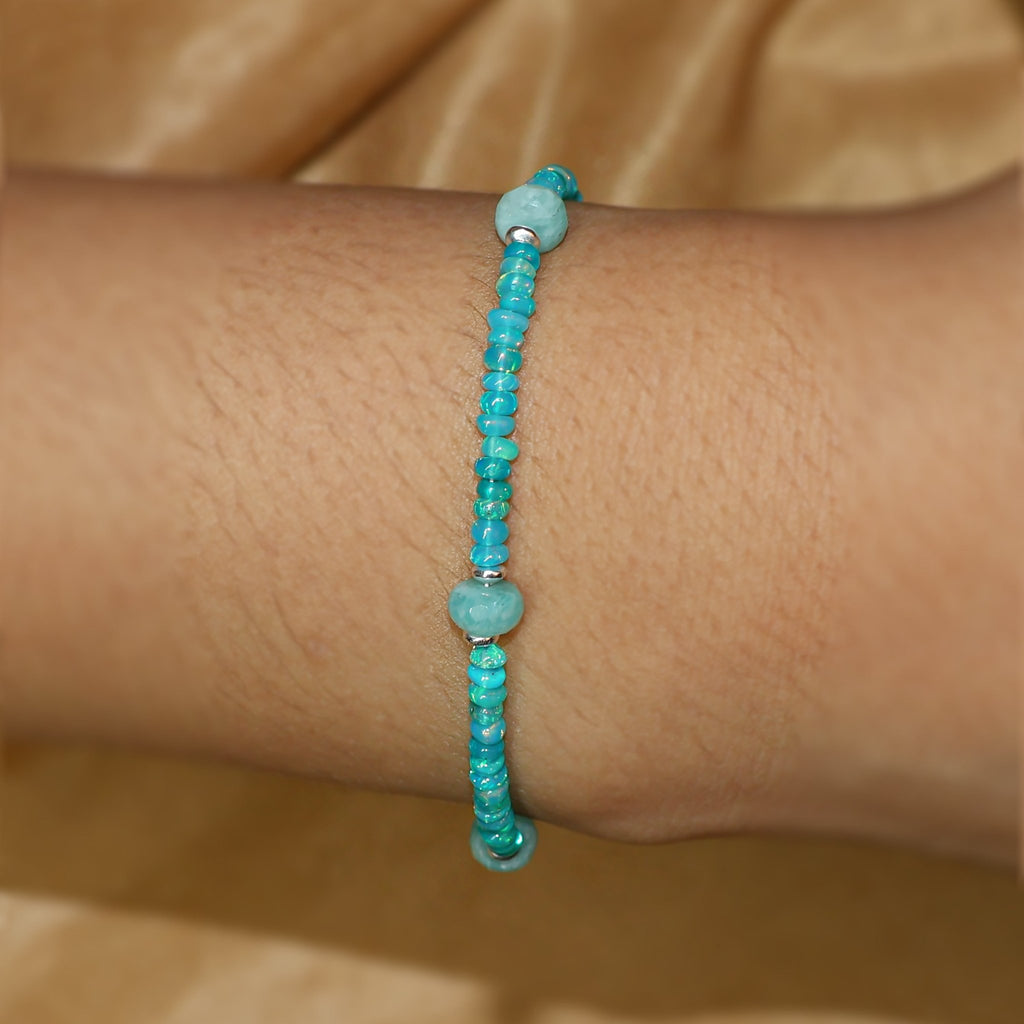 This bracelet features stunning Paraiba fire opal beads and vibrant Amazonite beads that come together to create a unique and eye-catching piece. The rare Paraiba fire opal adds a touch of luxury while the Amazonite offers a sense of calm and balance. Elevate your style with this exquisite bracelet.