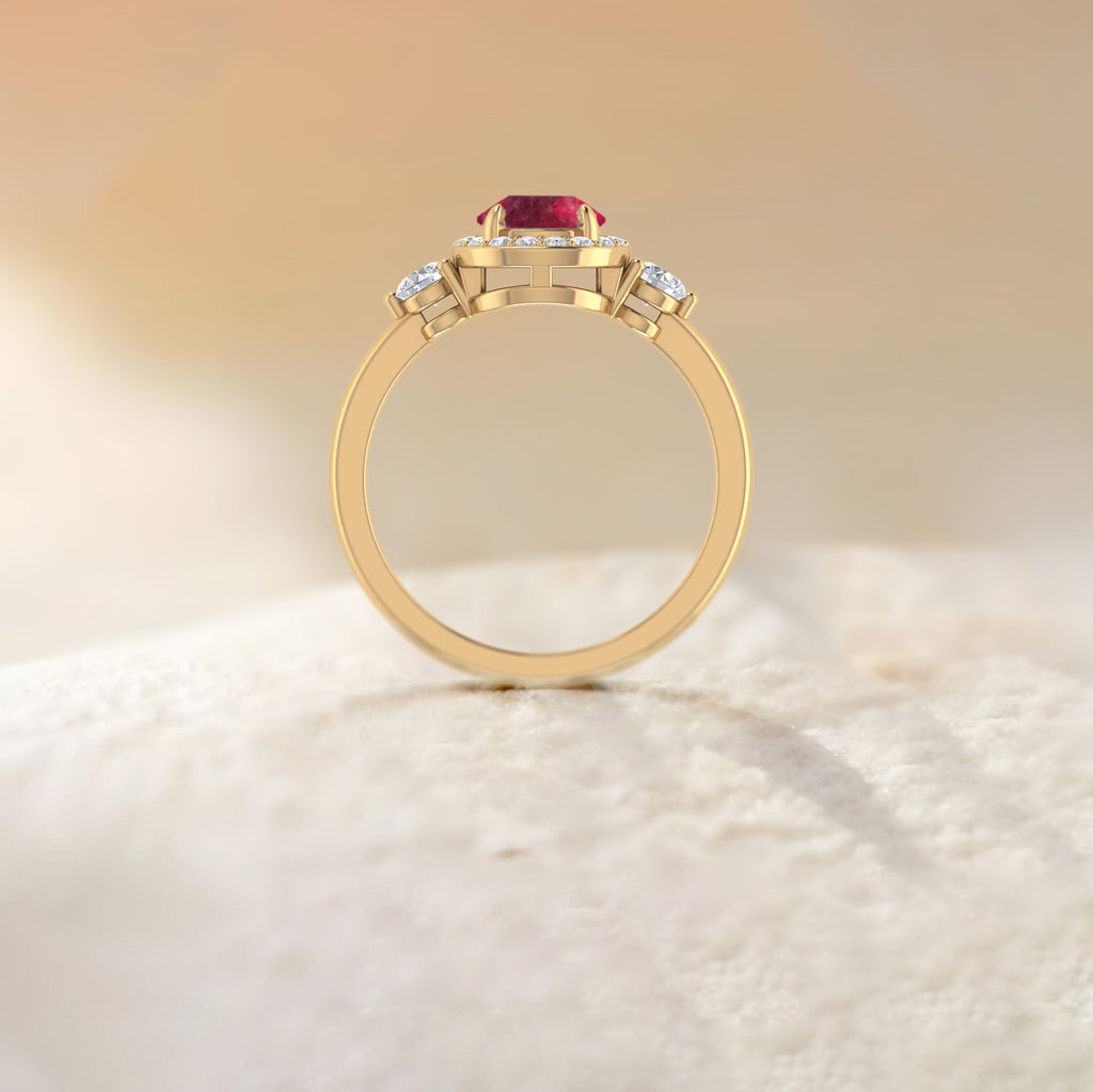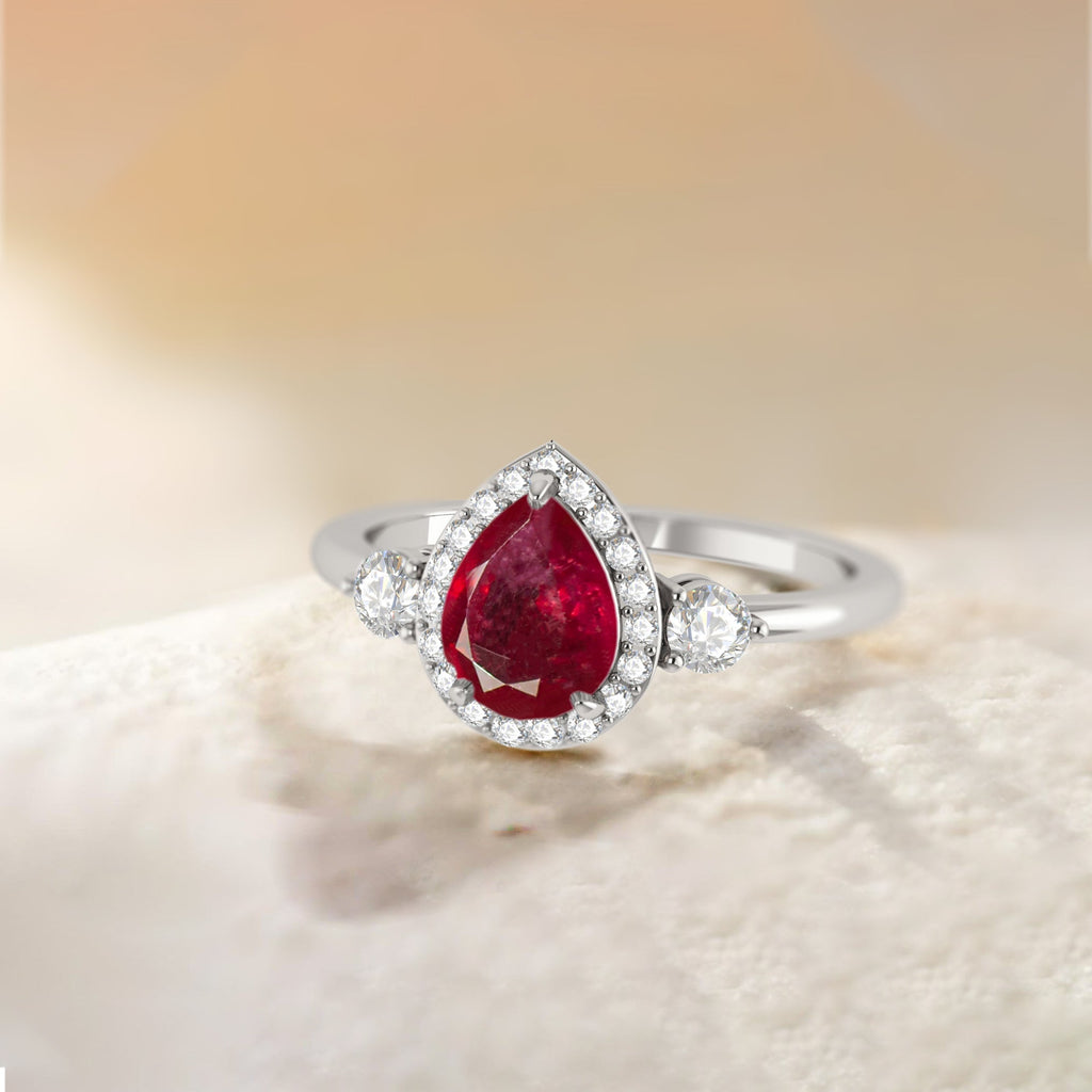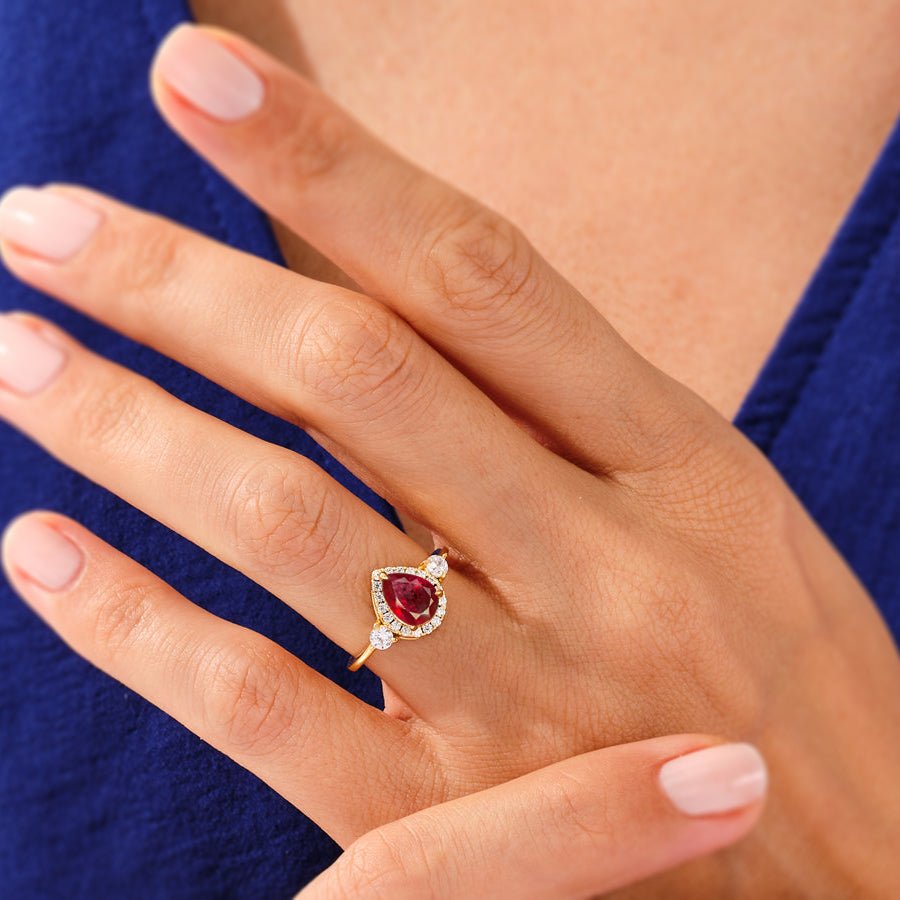 RubyNatural Ruby 925 Sterling Silver Halo Ring, featuring a genuine 8x6 mm pear-shaped Ruby set in premium sterling silver with a luxurious yellow gold fill. Designed for women who appreciate unique and meaningful birthstone jewelry, this ring offers timeless elegance combined with sophisticated style. Whether you're searching for the perfect gift for your mother, wife, or girlfriend, this ring makes a memorable present for anniversaries, weddings, birthdays, or any special occasion. The eye-catching Ruby symbolizes mystery and beauty, making this piece a cherished keepsake that expresses love and thoughtfulness.