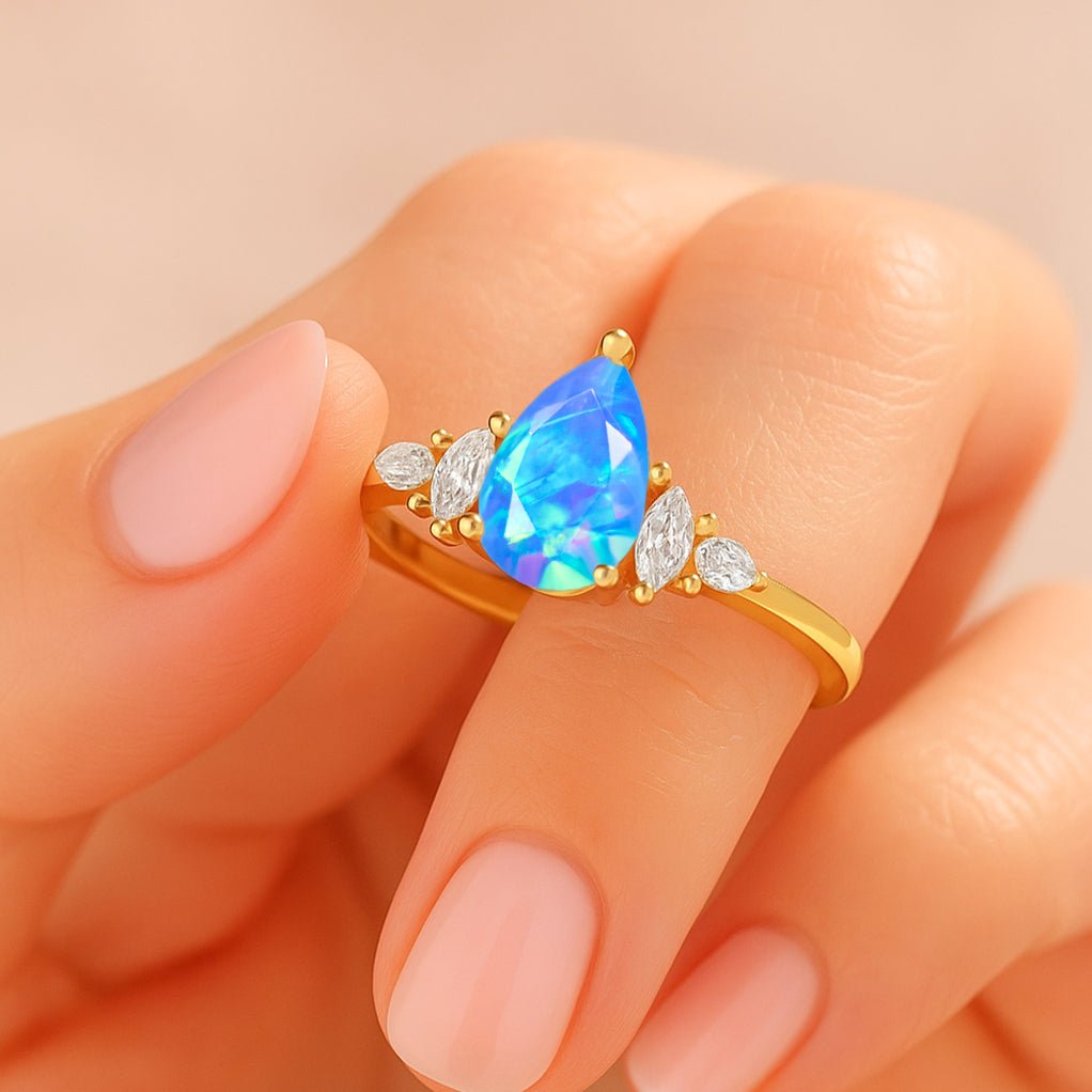 Blue OpalIlluminate her world with the captivating beauty of this pear-cut blue opal solitaire ring—an elegant blend of artistry, symbolism, and timeless style. Handcrafted from 3.45 grams of polished 925 sterling silver, this ring features a stunning 8×6 mm faceted natural blue opal, weighing approximately 1 carat. As October’s birthstone, blue opal is treasured for its mystical allure and fiery play-of-color, especially the vivid reds and greens found in premium AAA-grade stones. The pear-cut opal is set in a classic prong design, precisely angled to catch and reflect light with every movement. Its elegant silhouette and rich hues make it a striking statement for both everyday wear and special occasions. The slender band is crafted for comfort and durability, offering hypoallergenic and tarnish-resistant quality, ideal for those who value both style and substance.