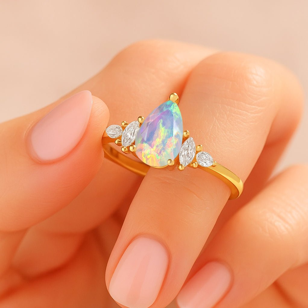 White OpalIlluminate her world with the captivating beauty of this pear-cut white opal solitaire ring—an elegant blend of artistry, symbolism, and timeless style. Handcrafted from 3.45 grams of polished 925 sterling silver, this ring features a stunning 8×6 mm faceted natural white opal, weighing approximately 1 carat. As October’s birthstone, the white opal is treasured for its mystical allure and fiery play of color, especially the vivid reds and greens found in premium AAA-grade stones. The pear-cut opal is set in a classic prong design, precisely angled to catch and reflect light with every movement. Its elegant silhouette and rich hues make it a striking statement for both everyday wear and special occasions. The slender band is crafted for comfort and durability, offering hypoallergenic and tarnish-resistant quality, ideal for those who value both style and substance.