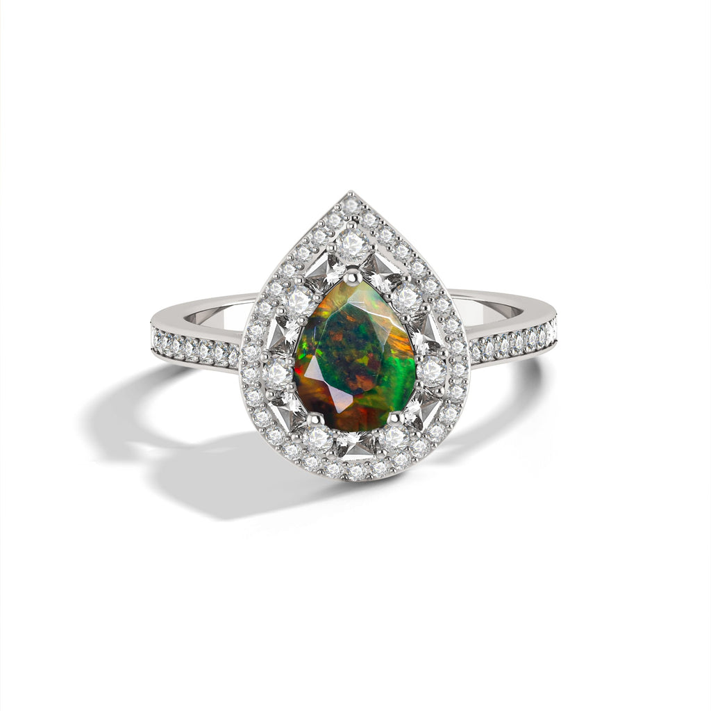 Black OpalNatural Black Opal 925 Sterling Silver Halo Ring. Make a bold statement with this exquisite Natural Black Opal Halo Ring, thoughtfully crafted for women who appreciate sophistication and sparkle. At the heart of this ring lies a genuine 1.0 carat pear-shaped black opal (8x6mm), celebrated for its captivating play-of-color, making each piece truly one-of-a-kind. Set in premium 925 sterling silver, this ring combines durability with high-end style. The halo setting accentuates the opal’s fiery tones, creating a stunning contrast that catches light and admiration from every angle. Perfect for celebrating love and life’s special moments, this ring makes an unforgettable gift for a mother, wife, or girlfriend.