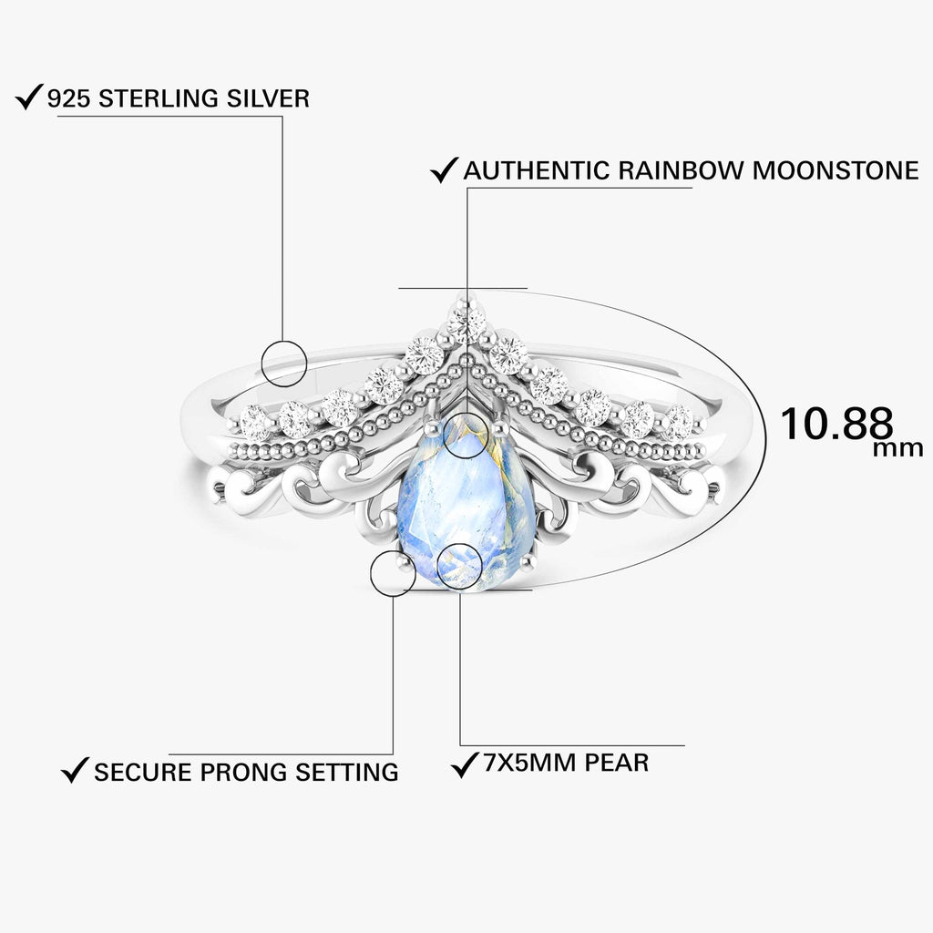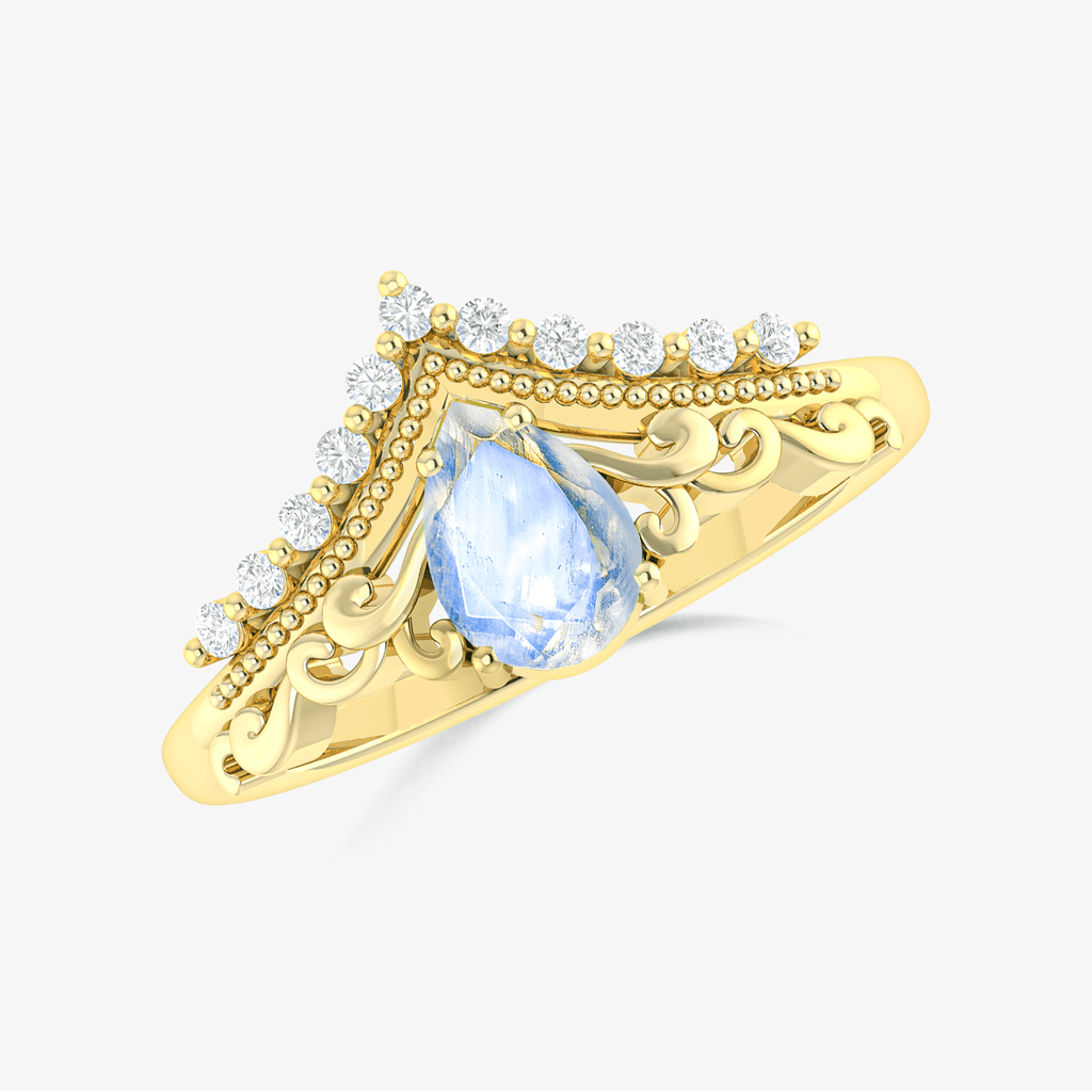 MoonstoneNatural Moonstone 925 Sterling Silver Crown Style Wishbone Ring, designed to captivate and inspire. Featuring a dazzling 6x4mm pear-shaped natural Moonstone, this ring is a true celebration of beauty, brilliance, and meaning. The crown-inspired setting enhances the Moonstone's vibrant play-of-color, making this a standout accessory for any occasion. Expertly crafted from high-quality 925 sterling silver, this ring combines luxury and durability. The warm gold tones beautifully contrast the mesmerizing Moonstone, creating a statement piece that’s both bold and feminine. Whether you're dressing up for a wedding or adding a touch of glamour to your everyday look, this ring effortlessly elevates your style.