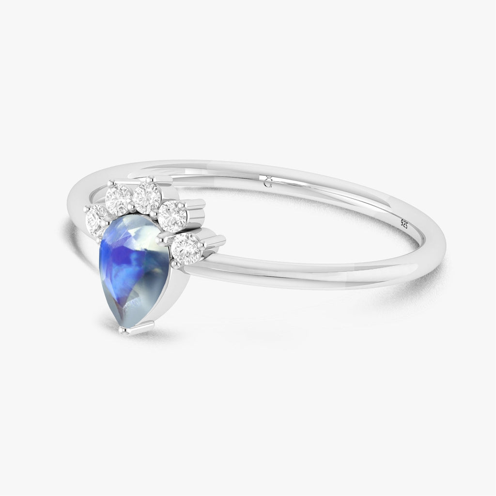 MoonstoneNatural Moonstone Ring, expertly crafted for women who appreciate exquisite jewelry. At the heart of this design is a mesmerizing 6x4 mm pear-shaped genuine Moonstone, known for its vivid play-of-color that shimmers with every movement. Whether under natural light or candle glow, this rare gemstone creates a captivating focal point that catches the eye. This stunning ring is made from solid 925 sterling silver for added brilliance and a touch of sophistication. Not only is it built to last, but its tarnish-resistant surface also ensures it remains radiant through years of wear. The band is adorned with a romantic floral motif, a delicate and feminine detail that symbolizes growth, beauty, and renewal.