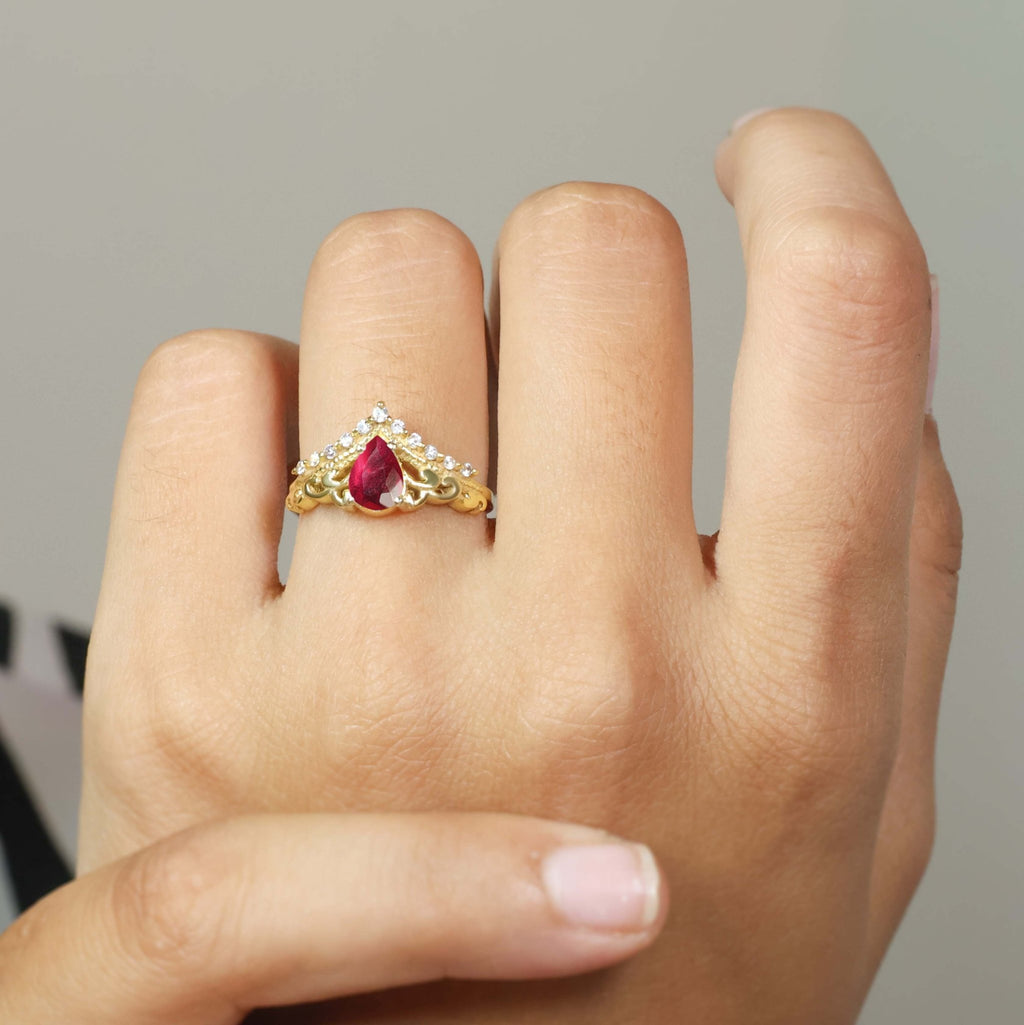 RubyNatural Ruby 925 Sterling Silver Crown Style Wishbone Ring, designed to captivate and inspire. Featuring a dazzling 6x4mm pear-shaped natural Ruby, this ring is a true celebration of beauty, brilliance, and meaning. The crown-inspired setting enhances the Ruby's vibrant play-of-color, making this a standout accessory for any occasion. Expertly crafted from high-quality 925 sterling silver and finished in yellow gold-filled plating, this ring combines luxury and durability. The warm gold tones beautifully contrast the mesmerizing Ruby, creating a statement piece that’s both bold and feminine.