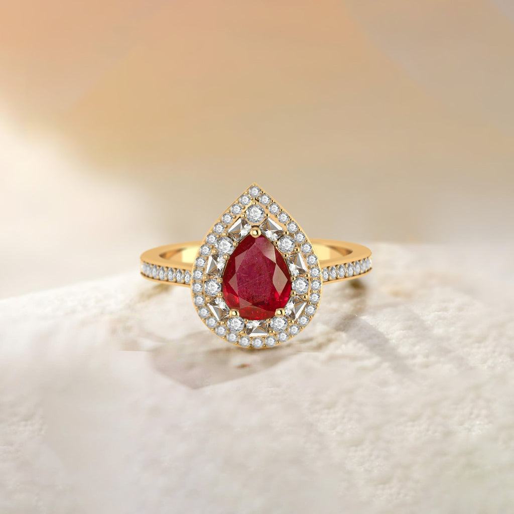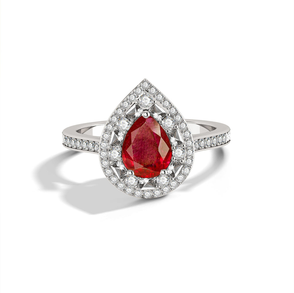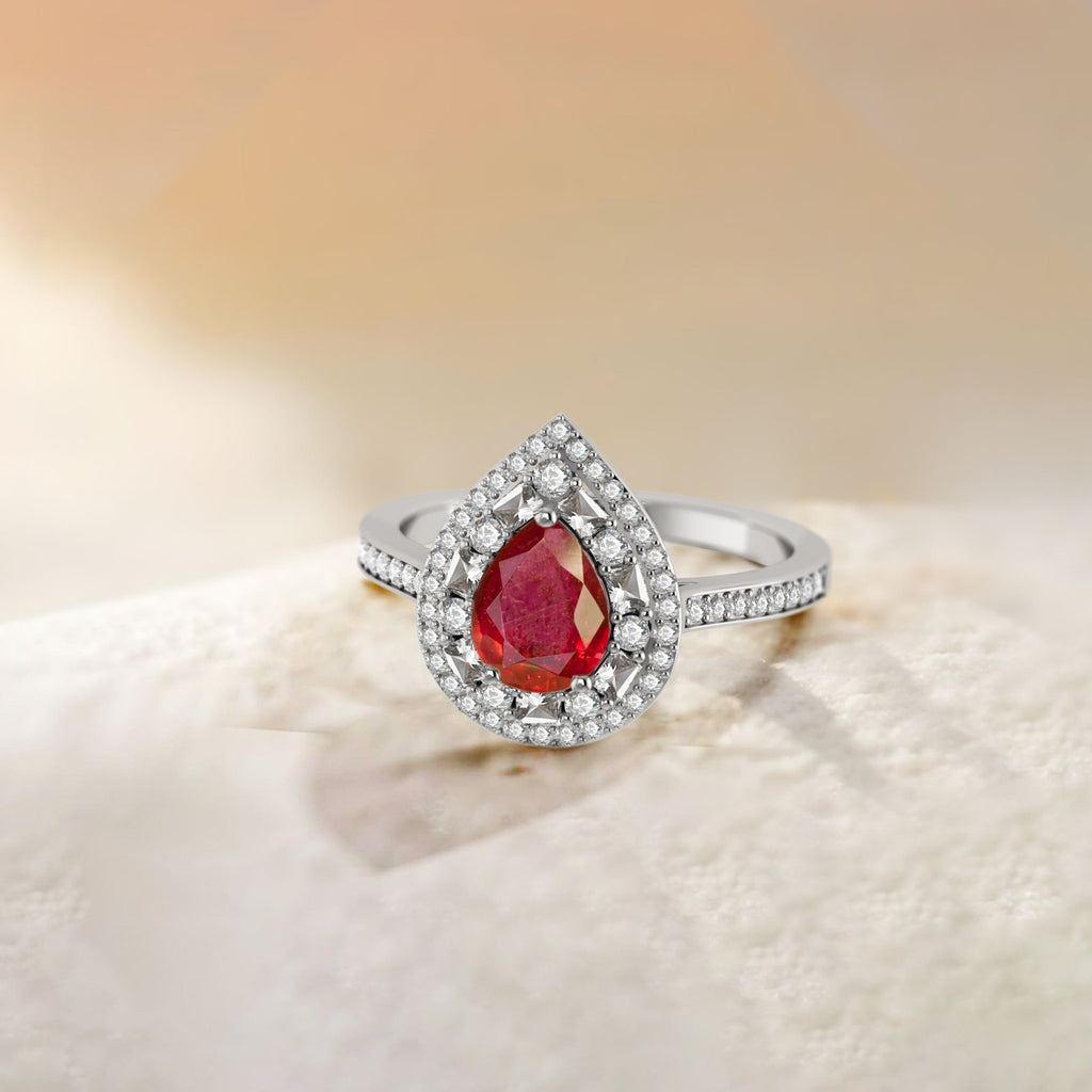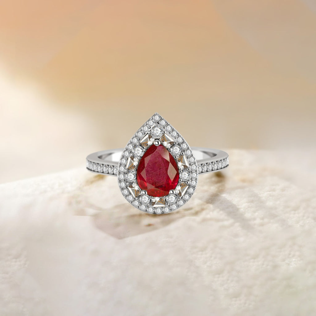 RubyNatural Ruby 925 Sterling Silver Halo Ring. Make a bold statement with this exquisite Natural Ruby Halo Ring, thoughtfully crafted for women who appreciate sophistication and sparkle. At the heart of this ring lies a genuine 1.0 carat pear-shaped Ruby (8x6mm), celebrated for its captivating play-of-color, making each piece truly one-of-a-kind. Set in premium 925 sterling silver, this ring combines durability with high-end style. The halo setting accentuates the Ruby’s fiery tones, creating a stunning contrast that catches light and admiration from every angle.