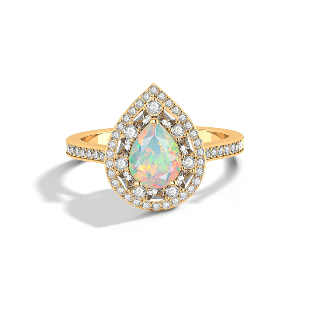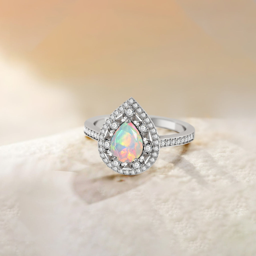 White OpalNatural White Opal 925 Sterling Silver Halo Ring. Make a bold statement with this exquisite Natural White Opal Halo Ring, thoughtfully crafted for women who appreciate sophistication and sparkle. At the heart of this ring lies a genuine 1.0 carat pear-shaped White Opal (8x6mm), celebrated for its captivating play-of-color, making each piece truly one-of-a-kind. Set in premium 925 sterling silver, this ring combines durability with high-end style. The halo setting accentuates the White Opal’s fiery tones, creating a stunning contrast that catches light and admiration from every angle. Perfect for celebrating love and life’s special moments, this ring makes an unforgettable gift for a mother, wife, or girlfriend.