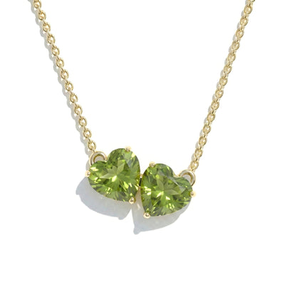 This Peridot Double Heart Pendant Necklace features two 5 mm faceted peridots totaling 1.3 ct, set in yellow gold-plated brass. The 7.90 × 11.87 mm heart pendant hangs from a 16" + 2" adjustable cable chain. Lightweight at 3.30 g, it’s perfect for everyday elegance or gifting. A timeless peridot heart necklace with vibrant sparkle.