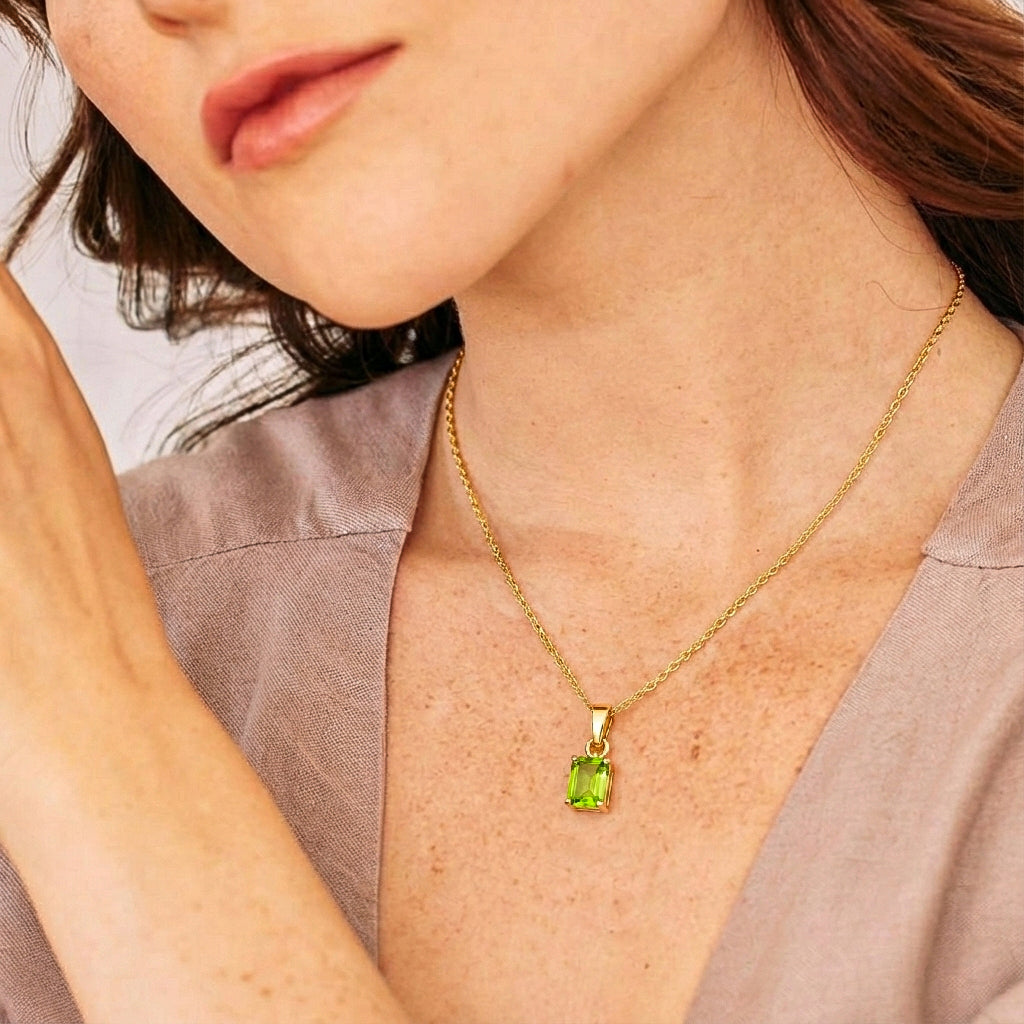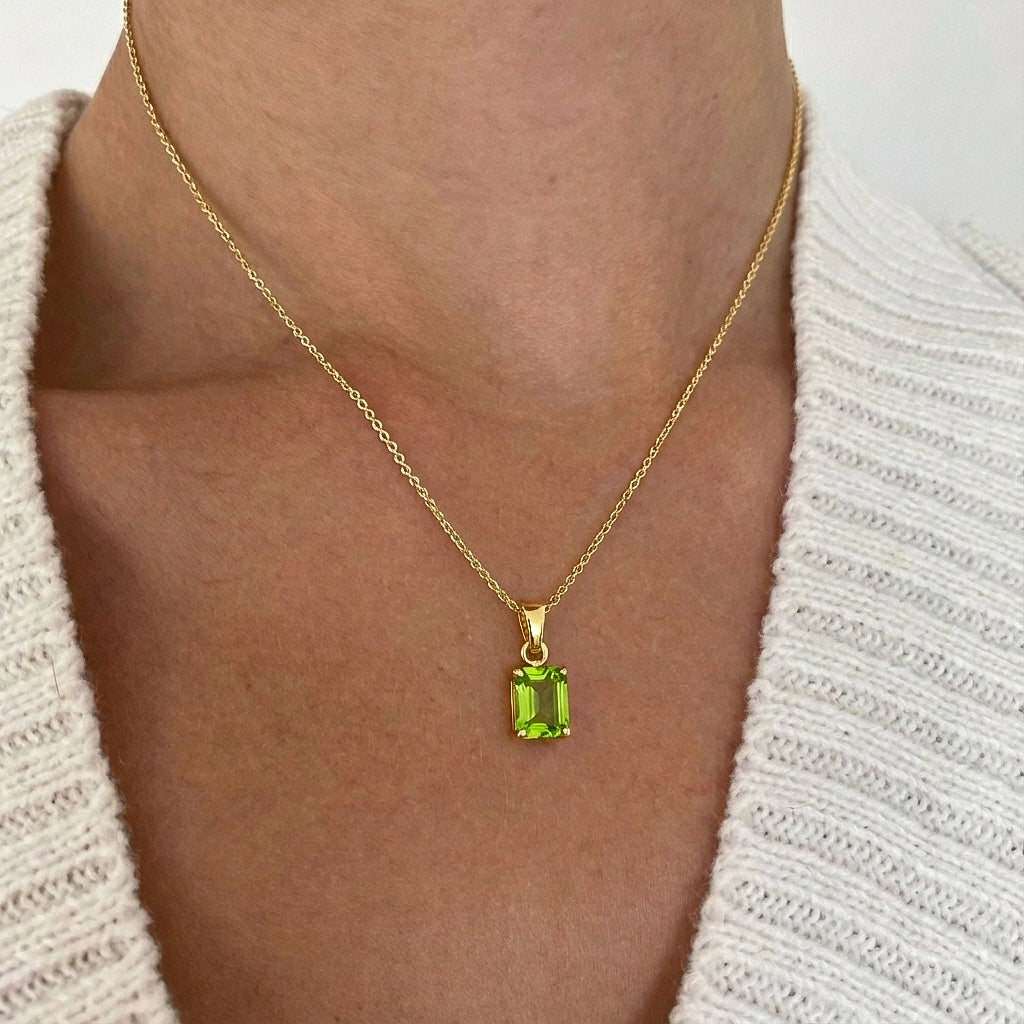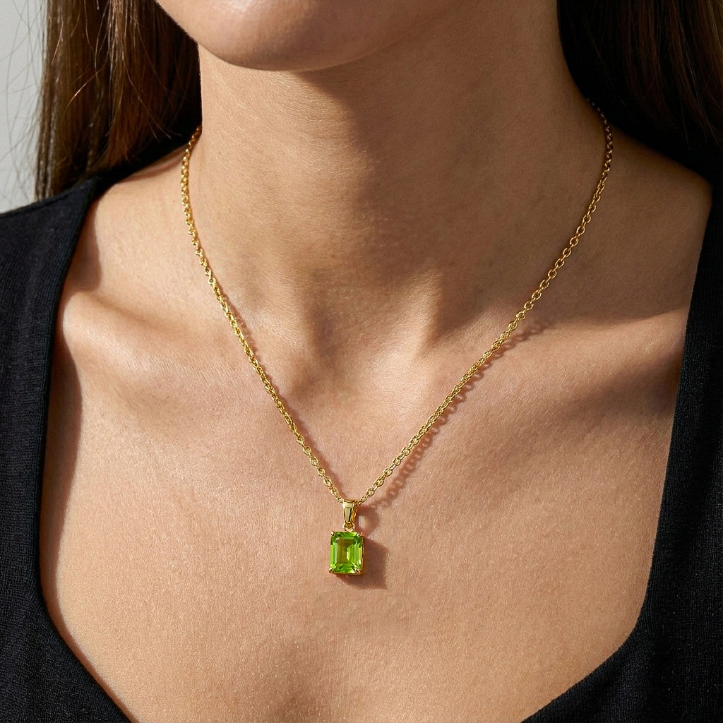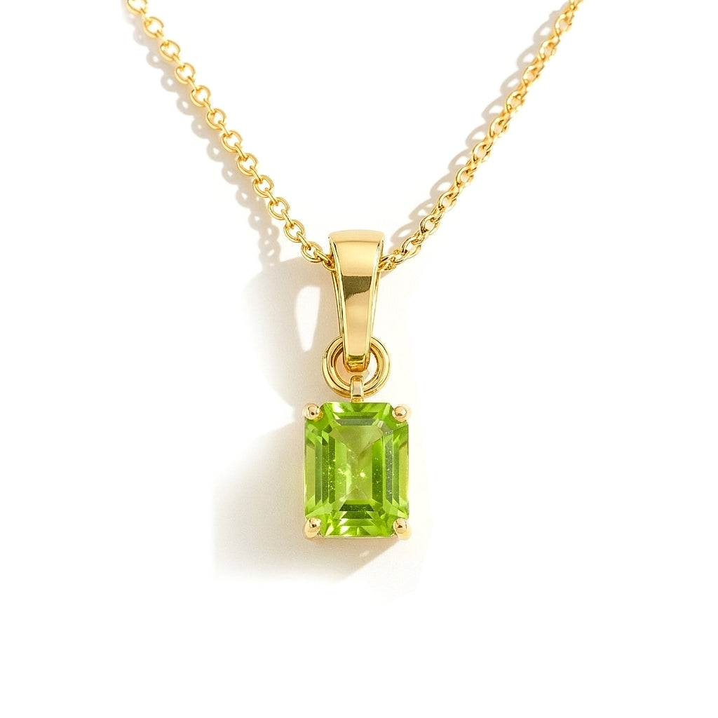 Brighten your style with this Peridot Octagon Solitaire Pendant Necklace. Featuring a faceted 9x7 mm octagon-shaped peridot (approx. 1.4 carats), this elegant pendant is set in yellow gold plated brass for a polished, radiant finish. Measuring 17.70 x 7 mm, the pendant hangs gracefully from a 16” + 2” adjustable cable chain with a secure lobster clasp. Perfect for everyday elegance or as a thoughtful gift for someone special.