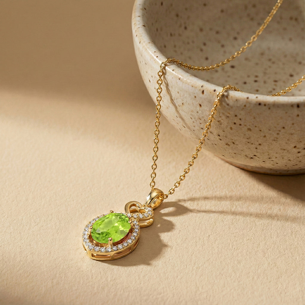 Brighten your look with this Peridot Oval Infinity Twist Heart Pendant Necklace crafted in yellow gold plated brass. Featuring a fresh 1.2ct oval-cut peridot (8x6 mm) with a brilliant faceted finish, this infinity heart design symbolizes love and positive energy. The pendant measures 24.55 x 11.64 mm and is paired with a 16” + 2” adjustable cable chain with a secure lobster clasp. Lightweight at approximately 5 grams with chain, it’s perfect for everyday wear or a thoughtful gift for any occasion.