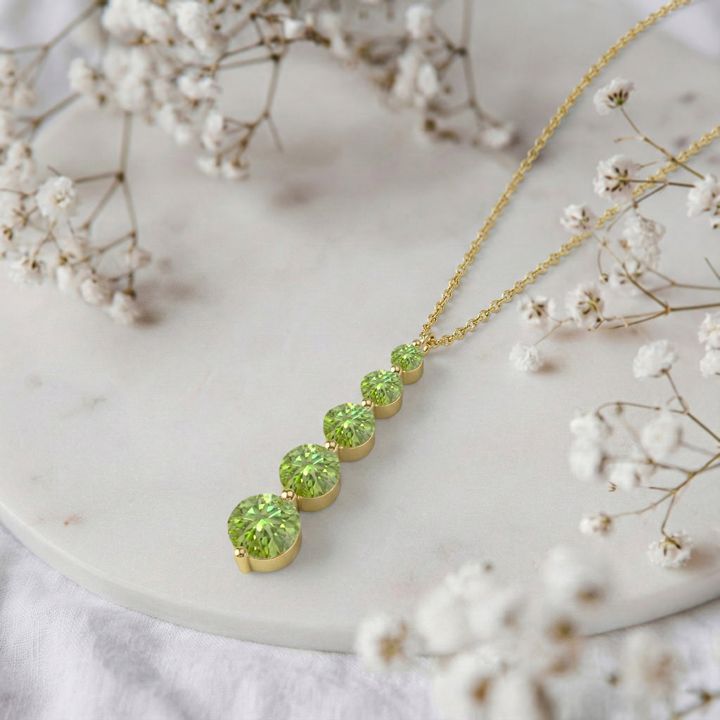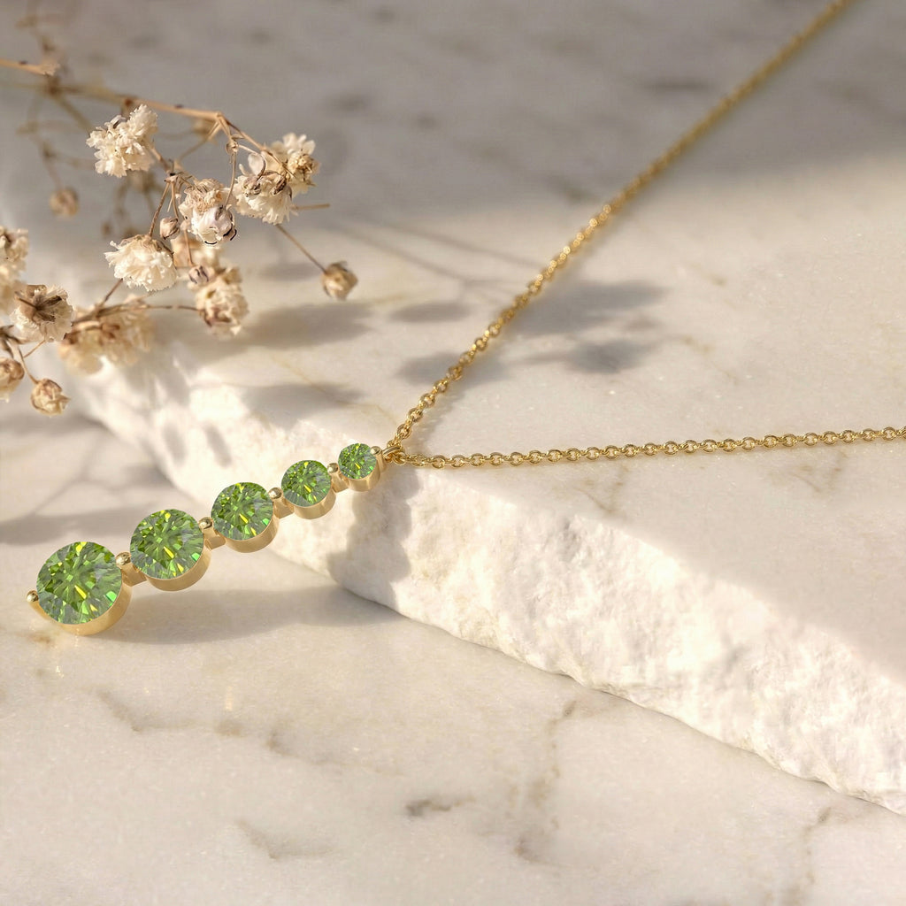 Brighten your look with this Peridot Round 5-Stone Bar Pendant Necklace, crafted in yellow gold-plated brass. Featuring five faceted peridots ranging from 3mm to 7mm (total 3.90 carats), the pendant measures 34.76 x 7.30 mm and hangs on a 16"+2" cable chain. Lightweight yet striking at 6.65g, it’s perfect for layering or wearing solo. Ideal as a birthstone jewelry gift or a chic everyday accessory, this necklace adds vibrant, sparkling elegance to any outfit.
