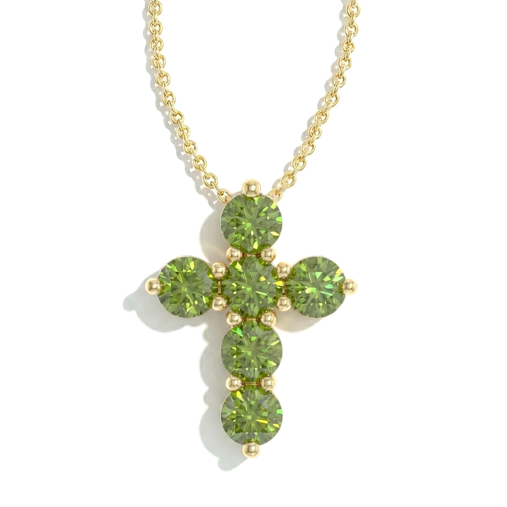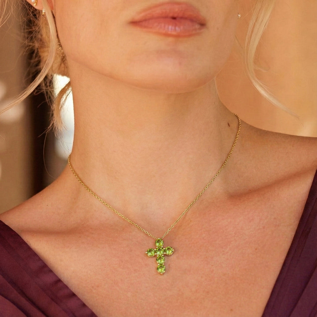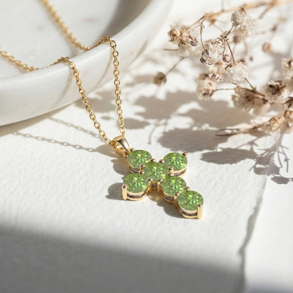 Vibrant and refreshing, this cross pendant necklace features six faceted round peridot gemstones (5 mm each) set in yellow gold plated brass. With a total carat weight of approximately 3.90 CT, the lively green stones create a sparkling, eye-catching effect. The pendant measures 23.72 x 18.04 mm and hangs from a 16” + 2” adjustable cable chain with a secure lobster clasp. Weighing 7.50 gm with chain, this necklace adds a bright, elegant touch to both everyday and special-occasion outfits.