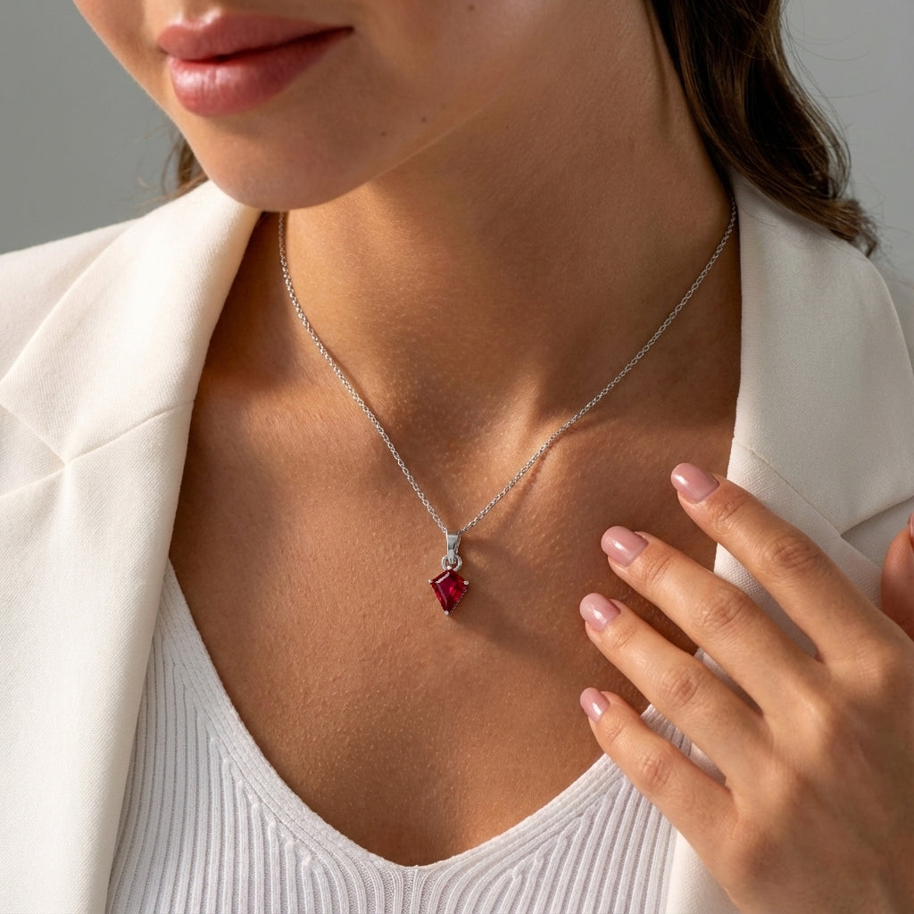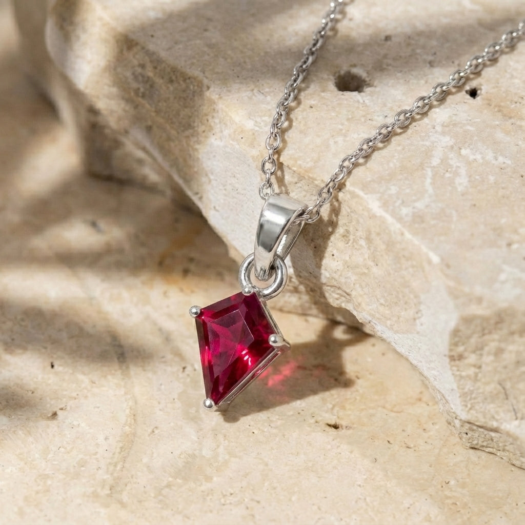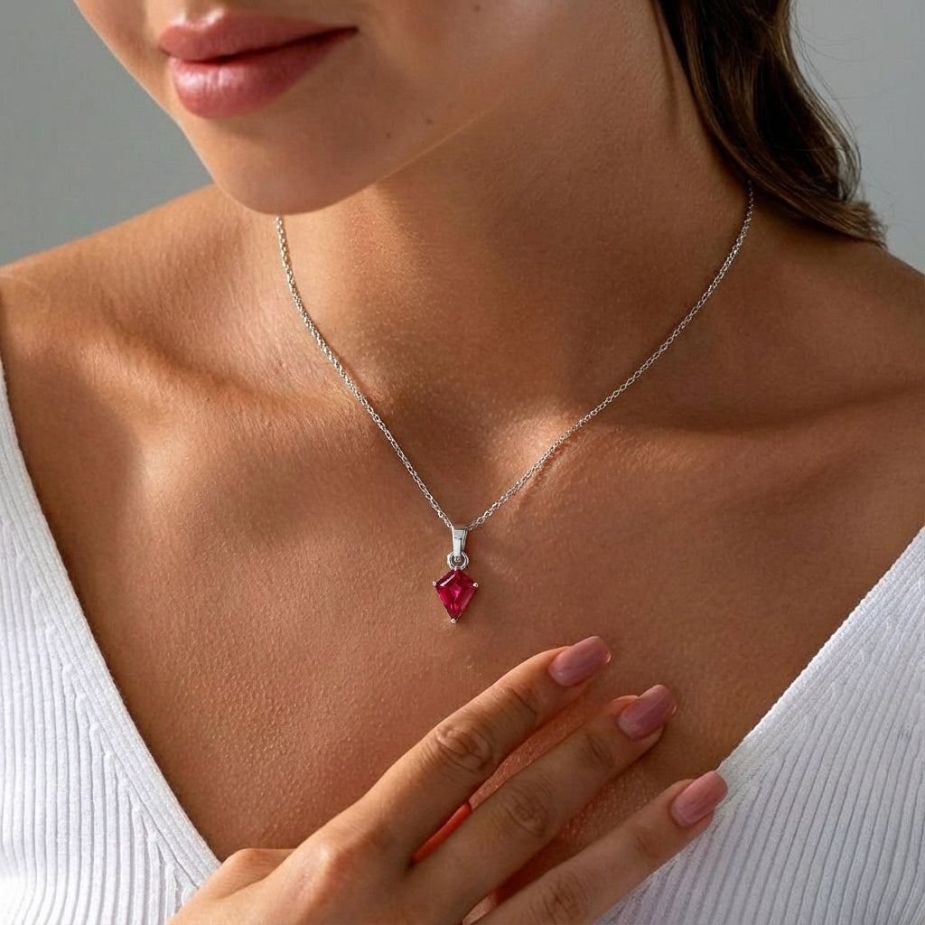 Ruby Kite Solitaire Pendant Necklace in 925 Sterling Silver 1.4ct features a stunning 9x7mm kite-shaped faceted ruby with deep, rich red hues. The pendant measures 18.20 x 7.40mm and is suspended from a 16” + 2” adjustable cable chain with a secure lobster clasp. Crafted from high-quality sterling silver and weighing 3.7 grams with the chain, this elegant necklace offers timeless beauty, vibrant color, and everyday comfort—perfect for gifting or adding a luxurious pop of color to any jewelry collection.