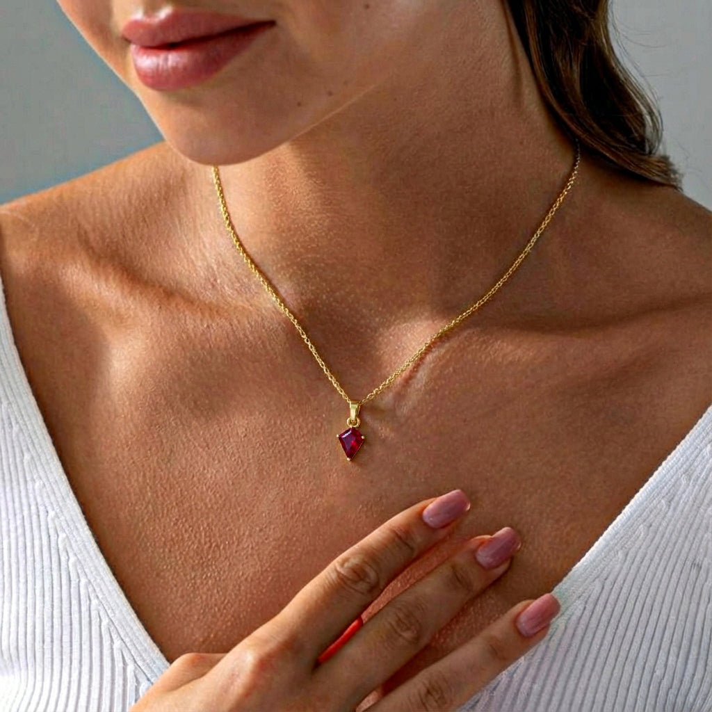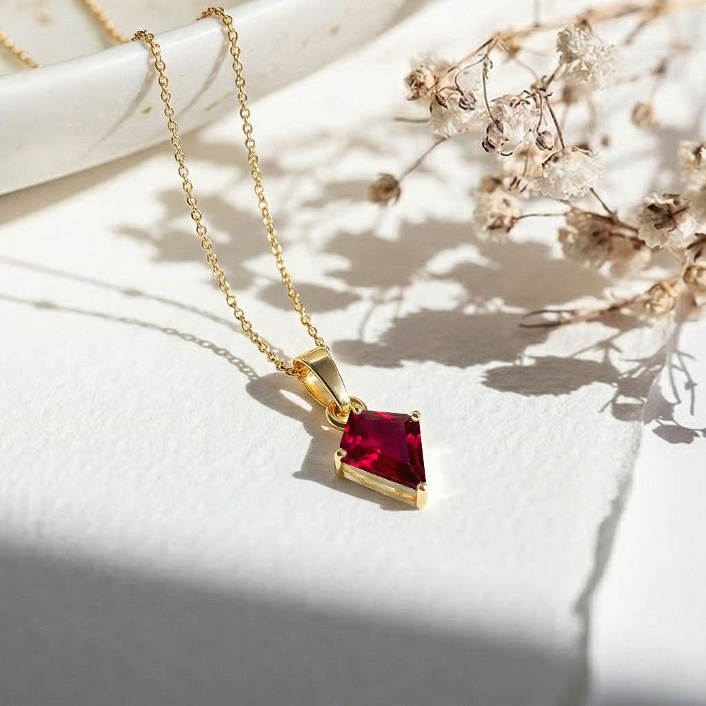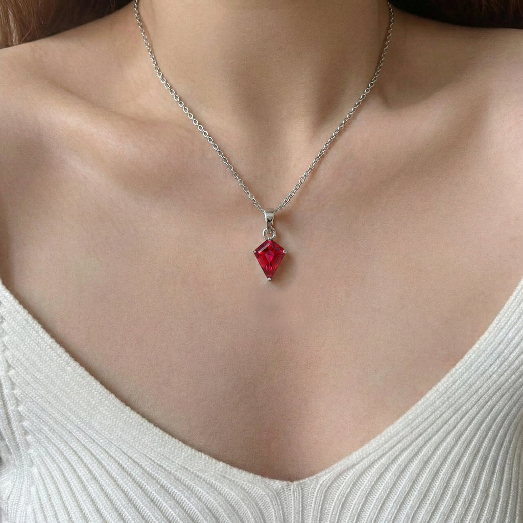 Ruby Kite Solitaire Pendant Necklace in 925 Sterling Silver 1.4ct features a stunning 9x7mm kite-shaped faceted ruby with deep, rich red hues. The pendant measures 18.20 x 7.40mm and is suspended from a 16” + 2” adjustable cable chain with a secure lobster clasp. Crafted from high-quality sterling silver and weighing 3.7 grams with the chain, this elegant necklace offers timeless beauty, vibrant color, and everyday comfort—perfect for gifting or adding a luxurious pop of color to any jewelry collection.