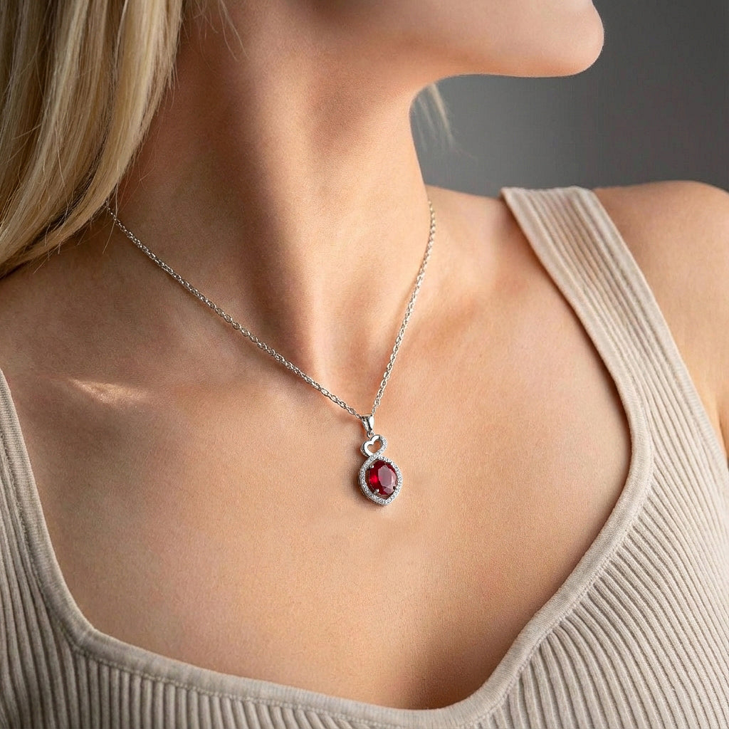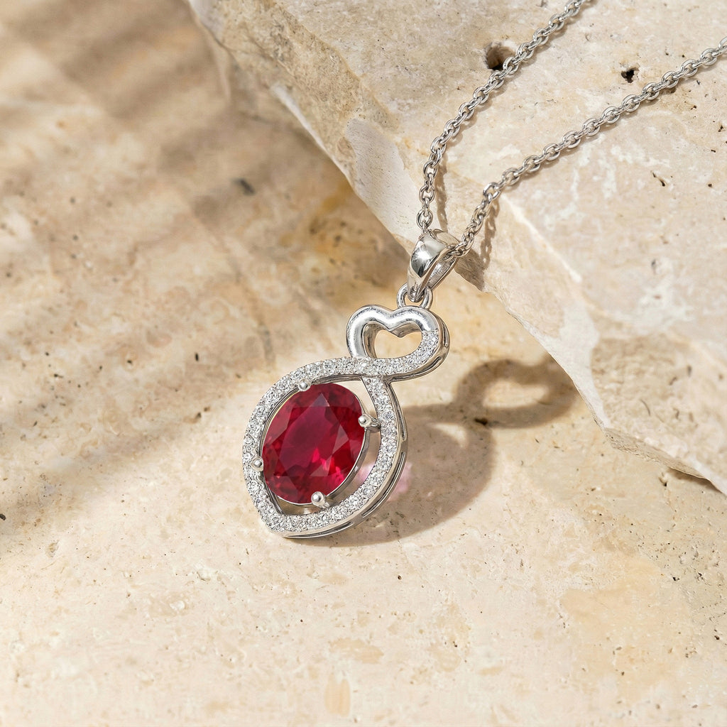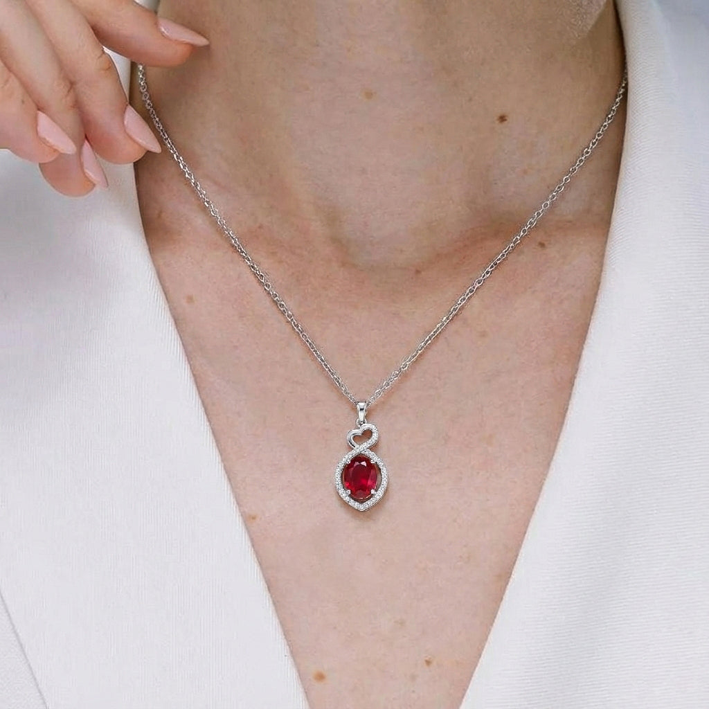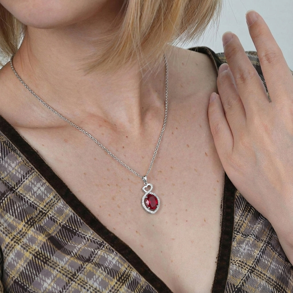 Ruby Oval Infinity Twist Heart Pendant Necklace in 925 Sterling Silver features a vibrant 1.2ct oval-cut ruby (8x6mm) set in a romantic infinity twist heart design, accented with 2ct sparkling cubic zirconia. The pendant measures 24.55 x 11.64mm and hangs from a 16” + 2” adjustable cable chain with a secure lobster clasp. Crafted from premium sterling silver, this elegant necklace offers rich red hues, timeless sophistication, and everyday comfort—perfect for gifting or adding a striking, eye-catching statement to any jewelry collection.
