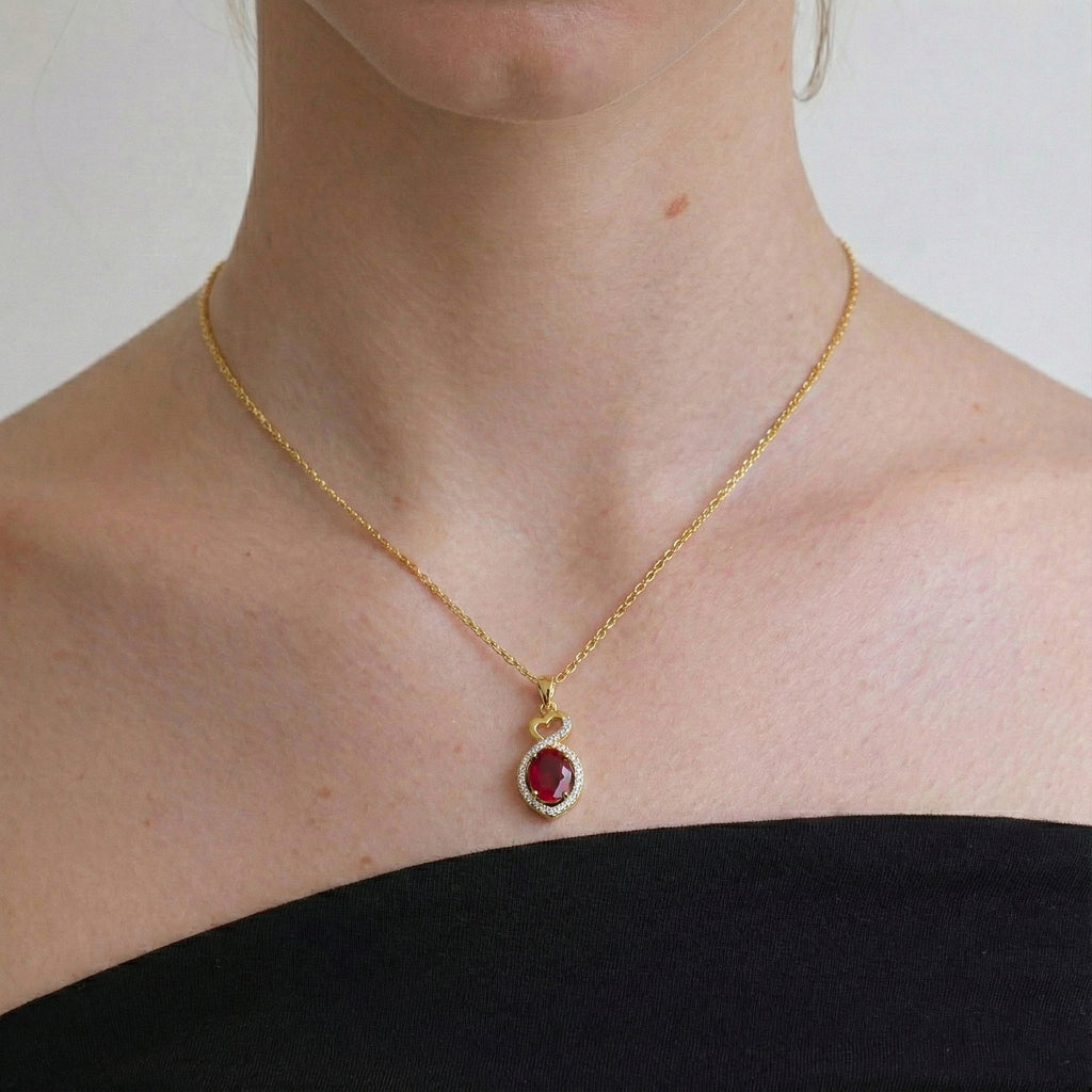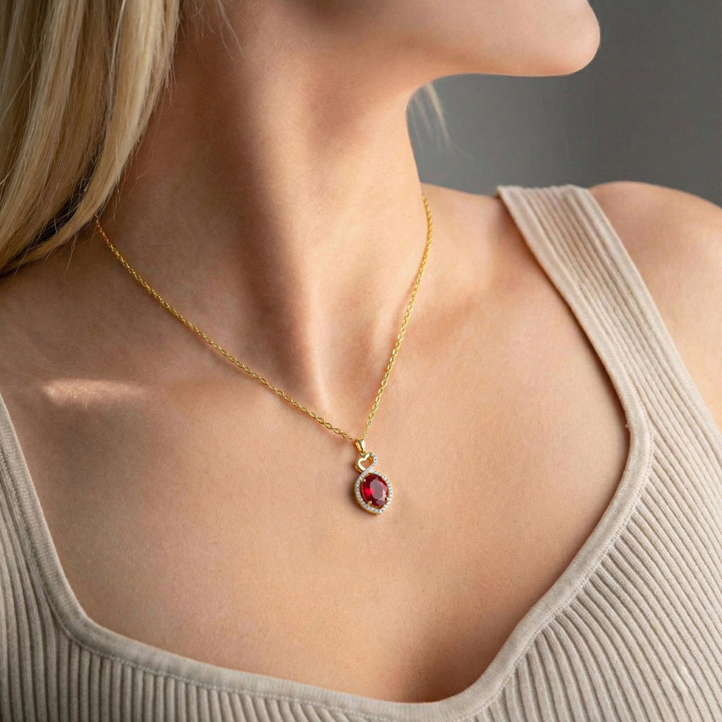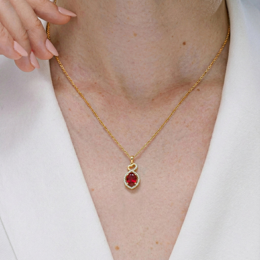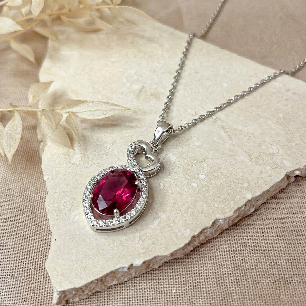 Ruby Oval Infinity Twist Heart Pendant Necklace in 925 Sterling Silver features a vibrant 1.2ct oval-cut ruby (8x6mm) set in a romantic infinity twist heart design, accented with 2ct sparkling cubic zirconia. The pendant measures 24.55 x 11.64mm and hangs from a 16” + 2” adjustable cable chain with a secure lobster clasp. Crafted from premium sterling silver, this elegant necklace offers rich red hues, timeless sophistication, and everyday comfort—perfect for gifting or adding a striking, eye-catching statement to any jewelry collection.