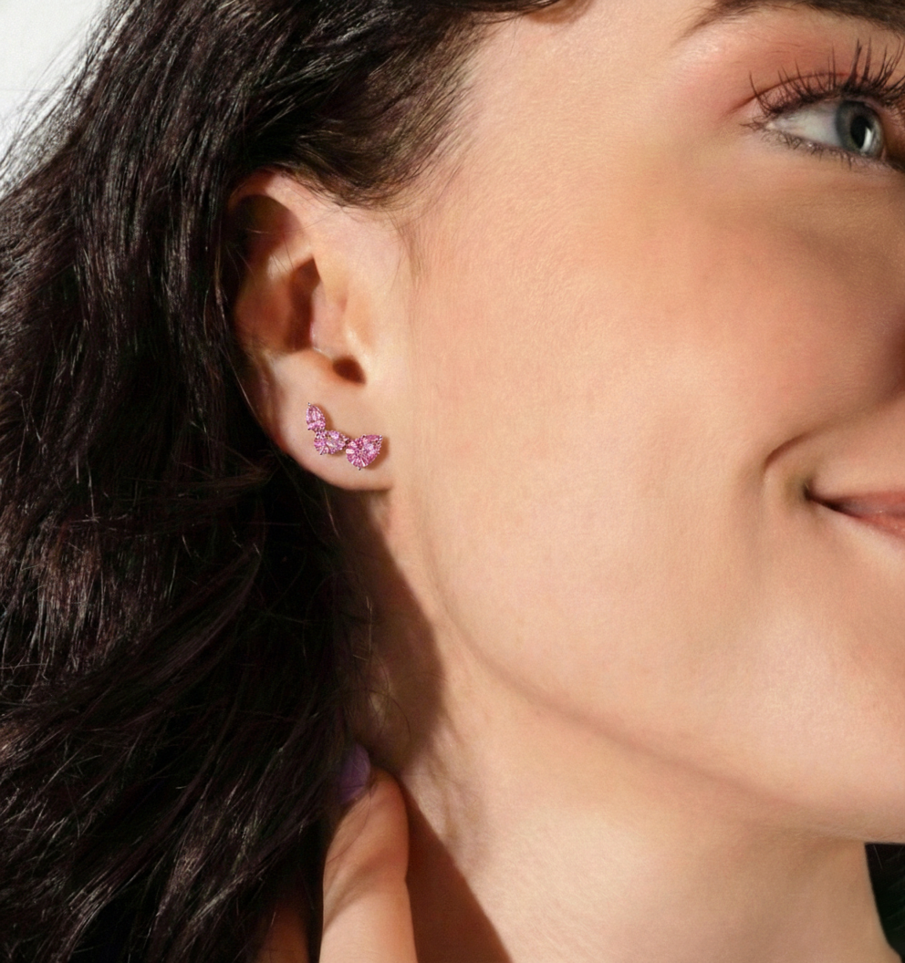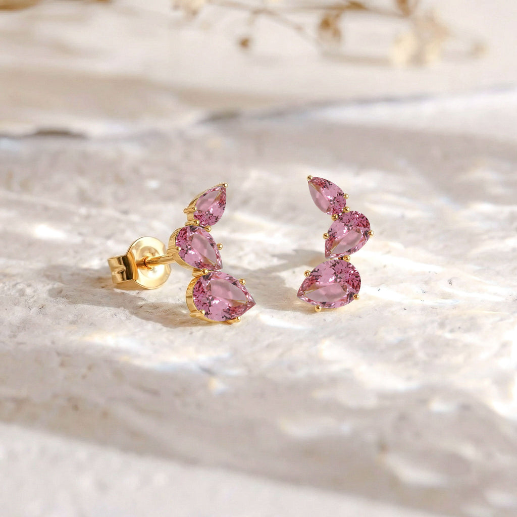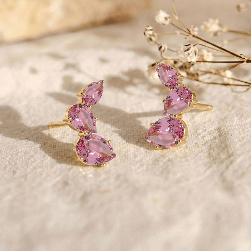 Brighten your style with these elegant Pink Tourmaline Pear Stud Earrings, crafted in yellow gold plated brass. Featuring six stunning faceted pink tourmaline stones in pear shapes (7x5mm - 2, 6x4mm - 2, 5x3mm - 2), these earrings offer a total carat weight of 3.30ct. With a size of 13.80 x 8.00mm and a lightweight of 2.60 grams, these pink tourmaline earrings combine beauty and comfort, making them the perfect accessory for any occasion.