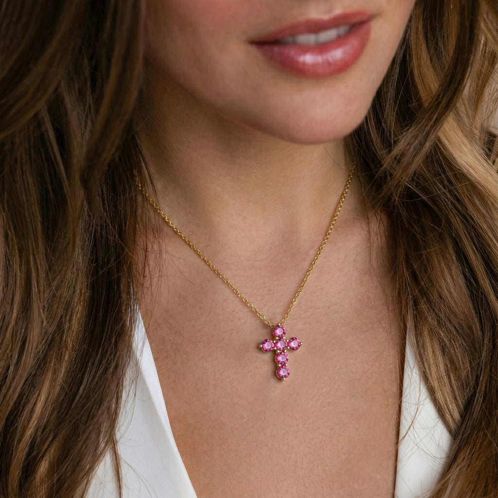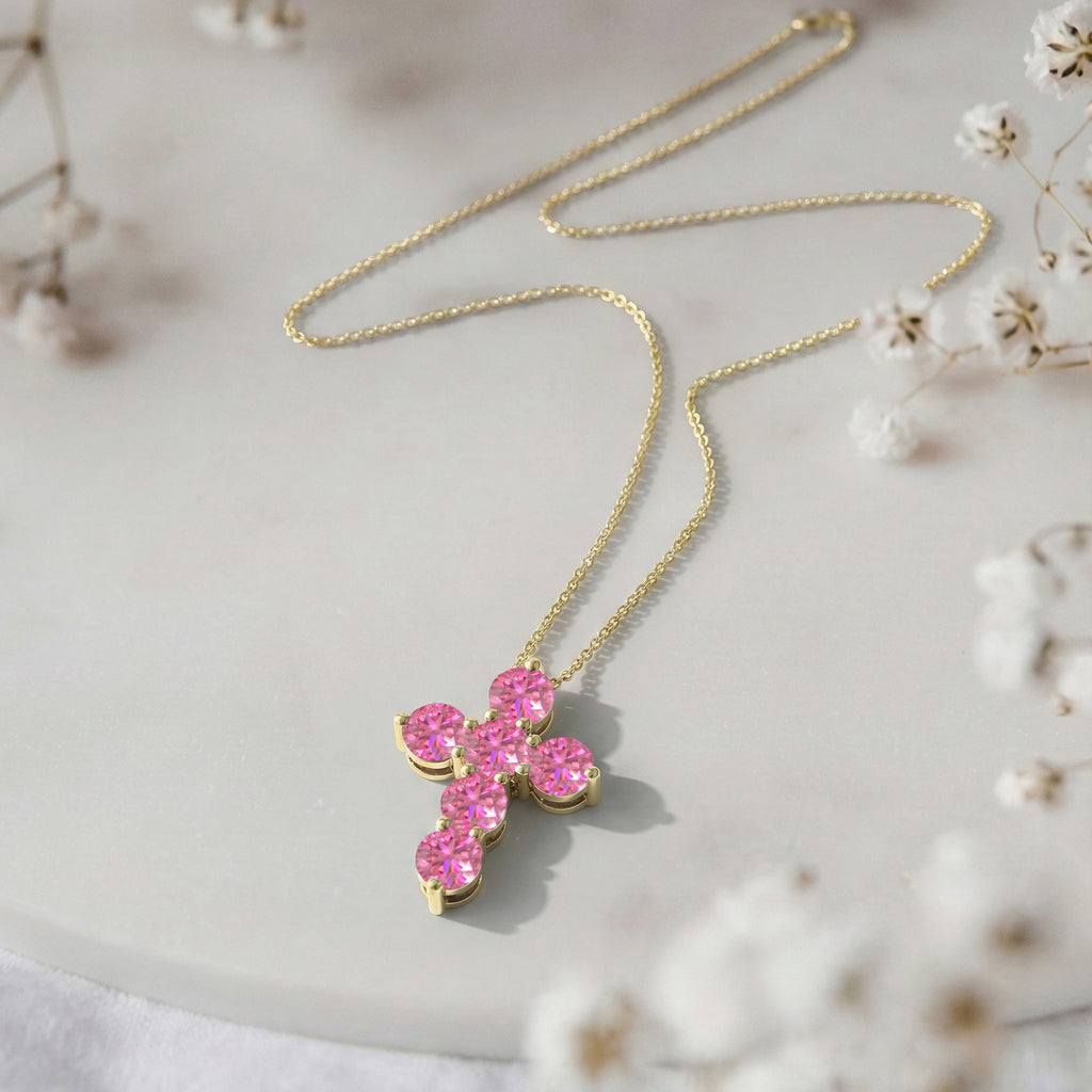 Charming and elegant, this cross pendant necklace features six faceted round pink tourmaline gemstones (5 mm each) set in yellow gold plated brass. With a total carat weight of approximately 3.90 CT, the soft pink stones create a vibrant, sparkling effect. The pendant measures 23.72 x 18.04 mm and hangs from a 16” + 2” adjustable cable chain with a secure lobster clasp. Weighing 7.50 gm with chain, this necklace is perfect for everyday wear or special occasions.