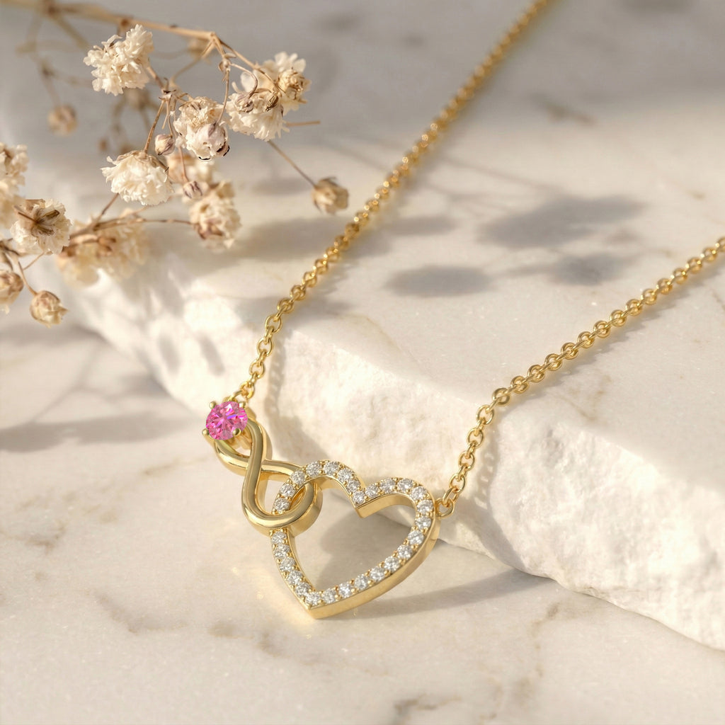 Add a pop of color with this Pink Tourmaline Round Infinity Heart Pendant Necklace in yellow gold-plated brass. Featuring a 0.45 ct, 4 mm round faceted pink tourmaline, the pendant measures 31.94 x 17.64 mm and hangs on a 16"+2" adjustable cable chain. Weighing 8 g with chain, it’s perfect for daily wear or special occasions. The vibrant pink tourmaline combined with the romantic infinity heart design makes this necklace a thoughtful gift for anniversaries, birthdays, or celebrating love and cherished moments.