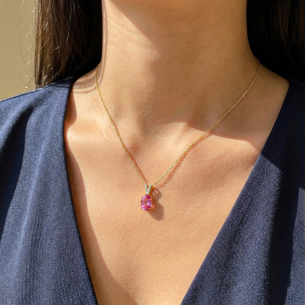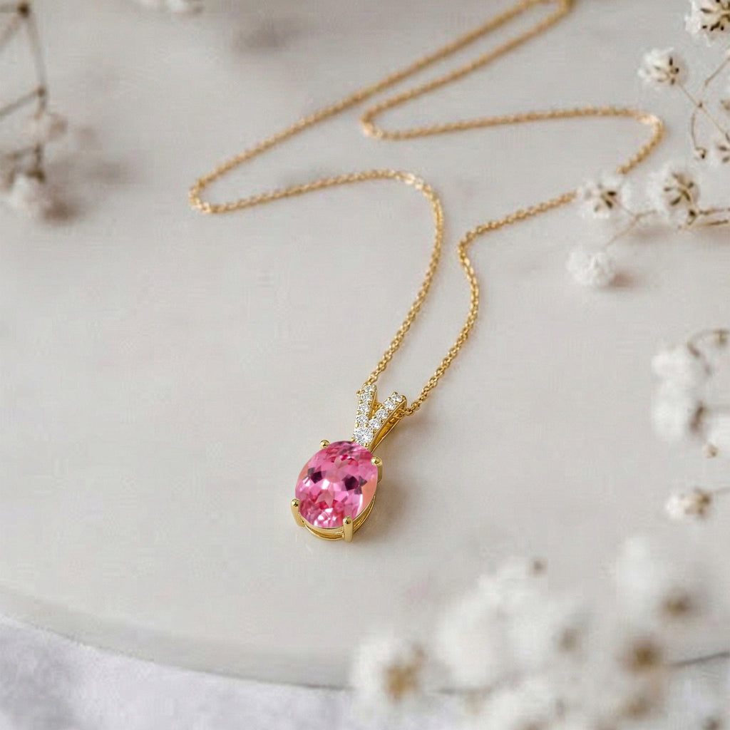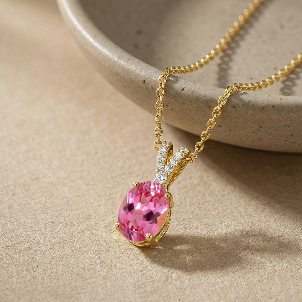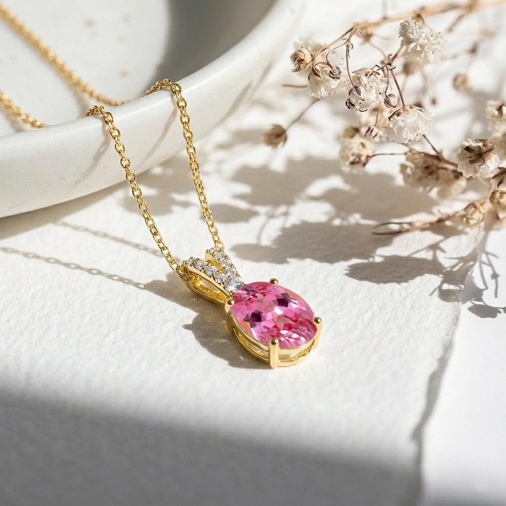 Add a touch of romantic elegance with this Pink Tourmaline Solitaire Pendant Necklace in yellow gold-plated brass. Featuring a 1.2 ct, 8×6 mm oval-cut pink tourmaline (approx. 1.5 ct CZ accent), the pendant measures 15.81 × 6.84 mm and is beautifully faceted for radiant sparkle. It hangs from a 16"+2" adjustable cable chain with a secure lobster clasp. Lightweight at 4 grams with chain, this necklace is perfect for everyday wear, layering, or gifting a graceful tourmaline jewelry piece.