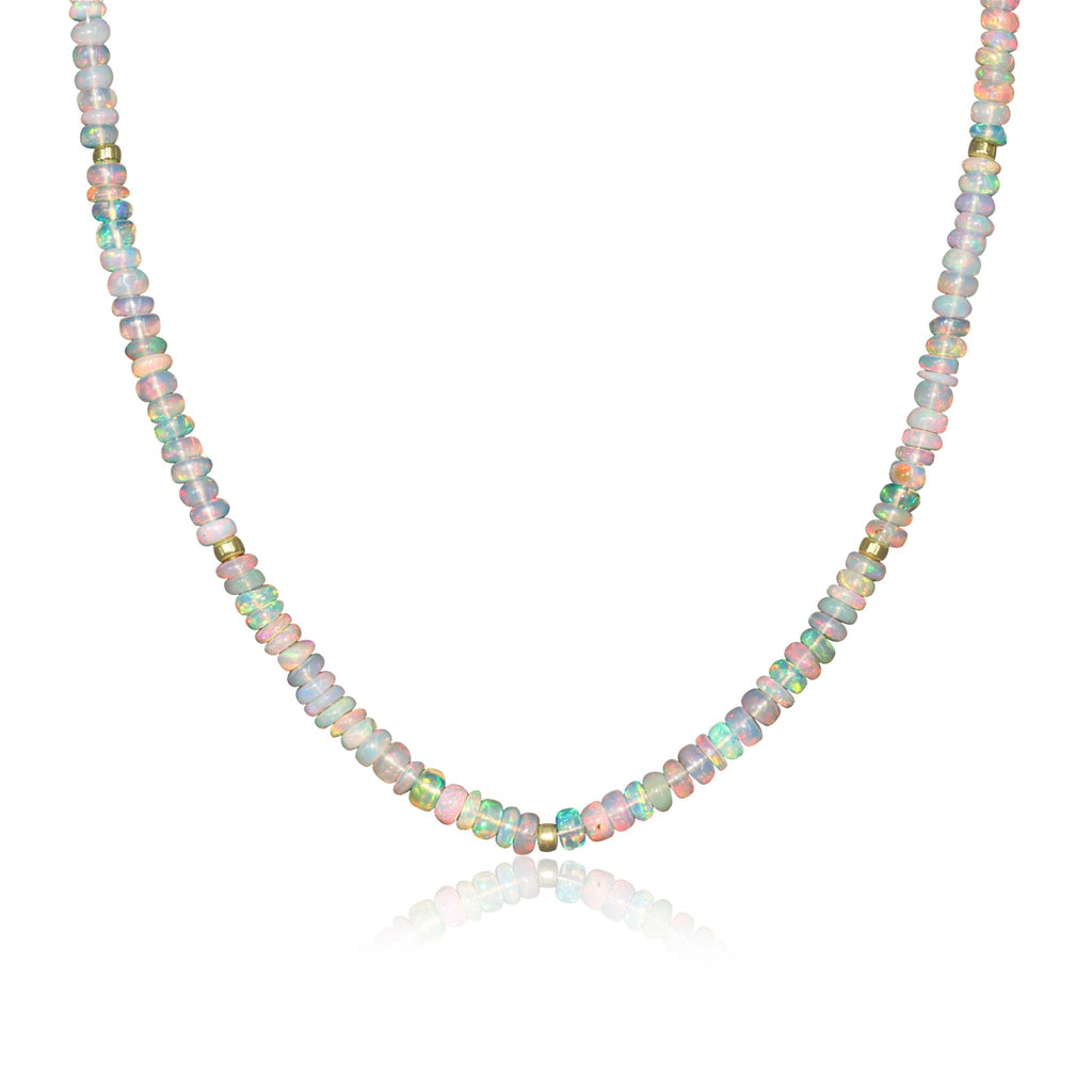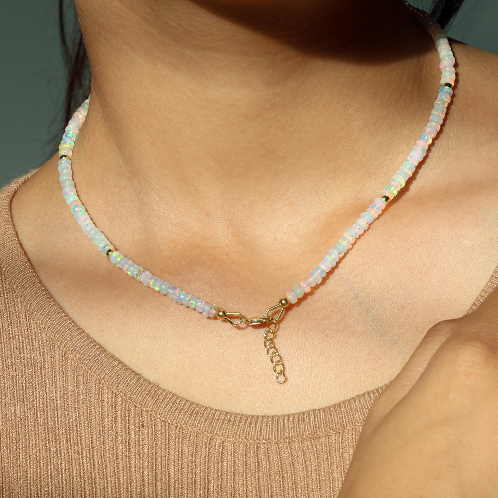 Natural White Opal Beaded Necklace. Crafted with high-quality 4x5 mm smooth rondelle-shaped white opal beads, this necklace adds a delicate shimmer to any outfit, perfect for both casual and formal occasions. The opal’s natural beauty captures light with every movement, ensuring you stand out with understated elegance. The necklace is made with 925 sterling silver, providing a sturdy and reliable base, timeless finish. The high-quality construction ensures durability and lasting beauty, making this piece a classic addition to your jewelry box.