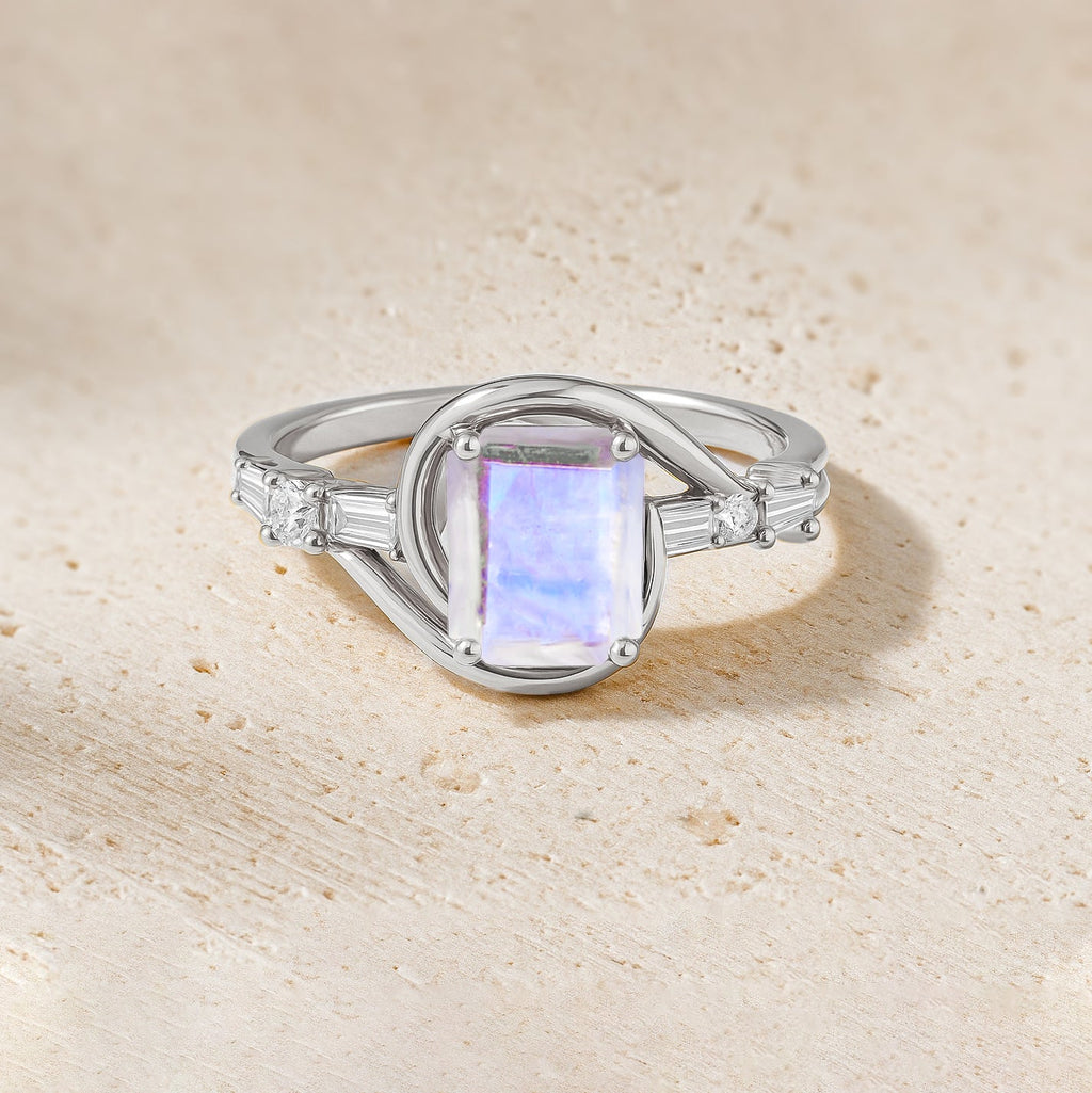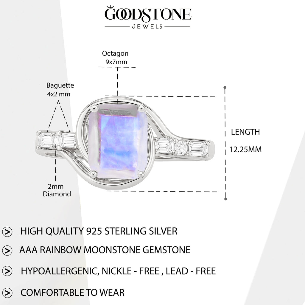 MoonstoneMake a bold statement with this stunning Moonstone Gemstone Ring. Featuring a vibrant AAA natural moonstone (9x7mm octagon cut) at the center, this ring is accented with sparkling baguette and round diamonds on each side, adding brilliance and sophistication to its design.