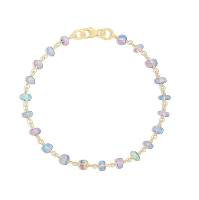 The exquisite rainbow white opal beads in this captivating bracelet are renowned for their captivating color play. A mesmerizing and ethereal appearance is produced by the way each opal bead shimmers with gentle iridescent hues, reflecting faint flashes of blue, pink, and green. The opals, when hung from a delicate chain, lend refinement and a hint of magic to any ensemble.