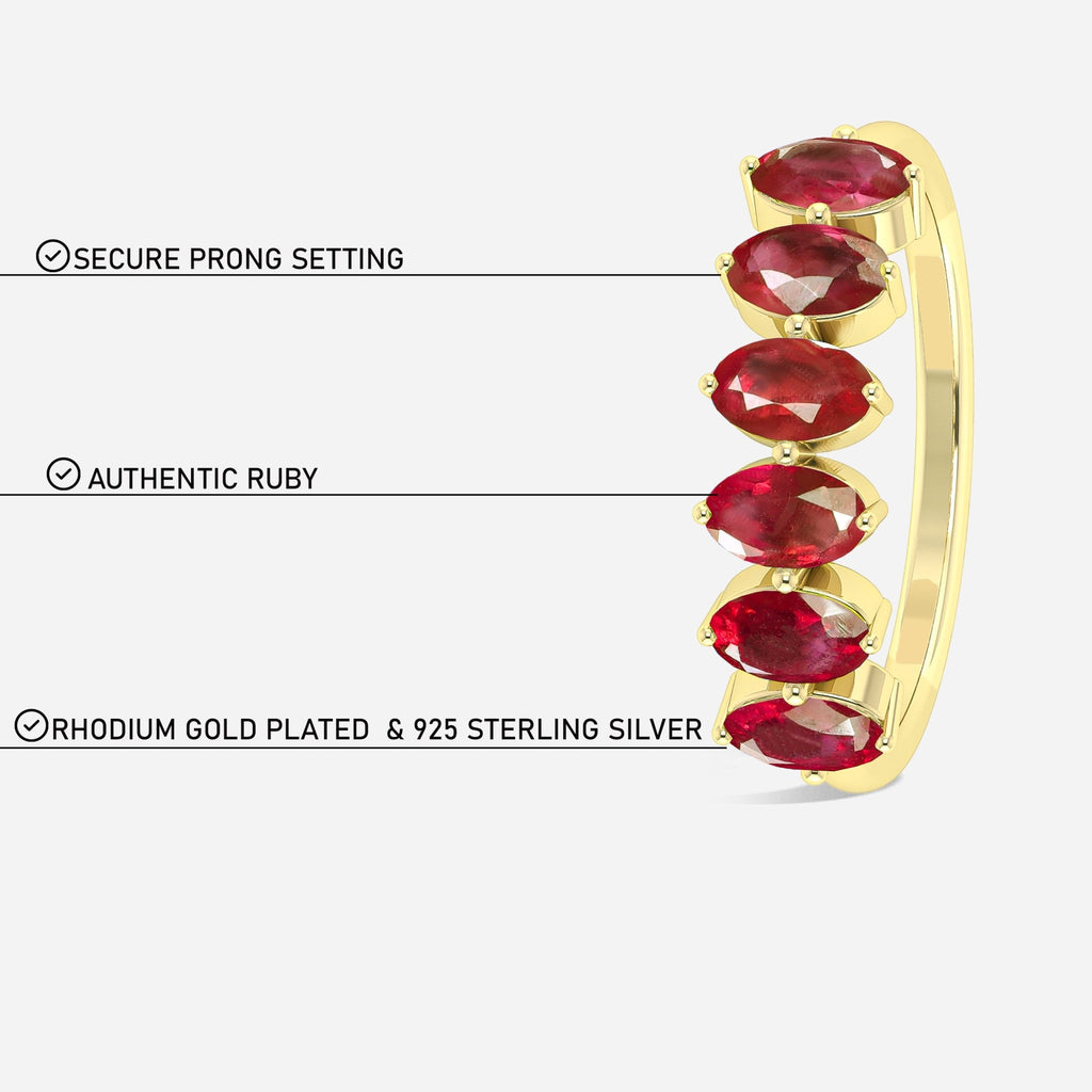 RubyThe image displays a captivating ring featuring six genuine red ruby gemstones. The vibrant red color of the rubies pops against the cool, 925 sterling silver band. This dazzling ring is a perfect choice for someone who appreciates classic elegance and the beauty of gemstones.