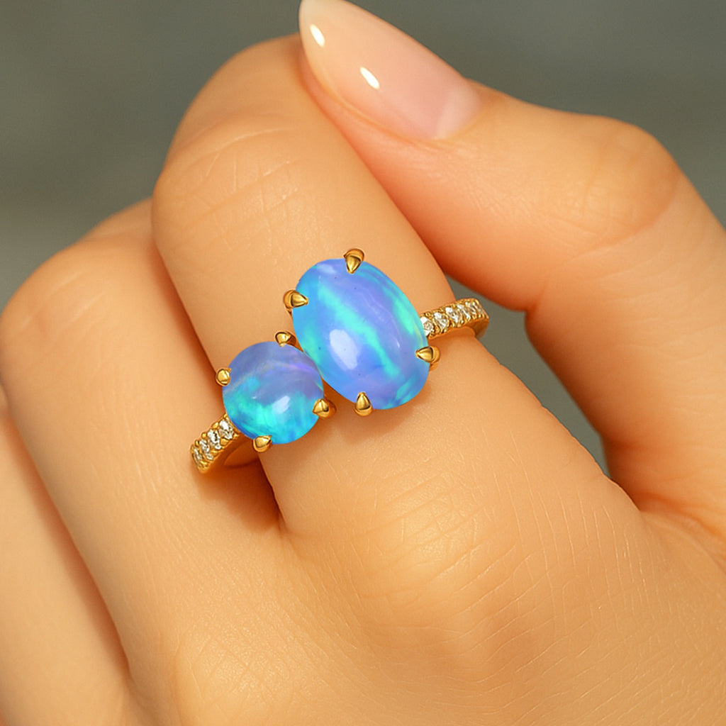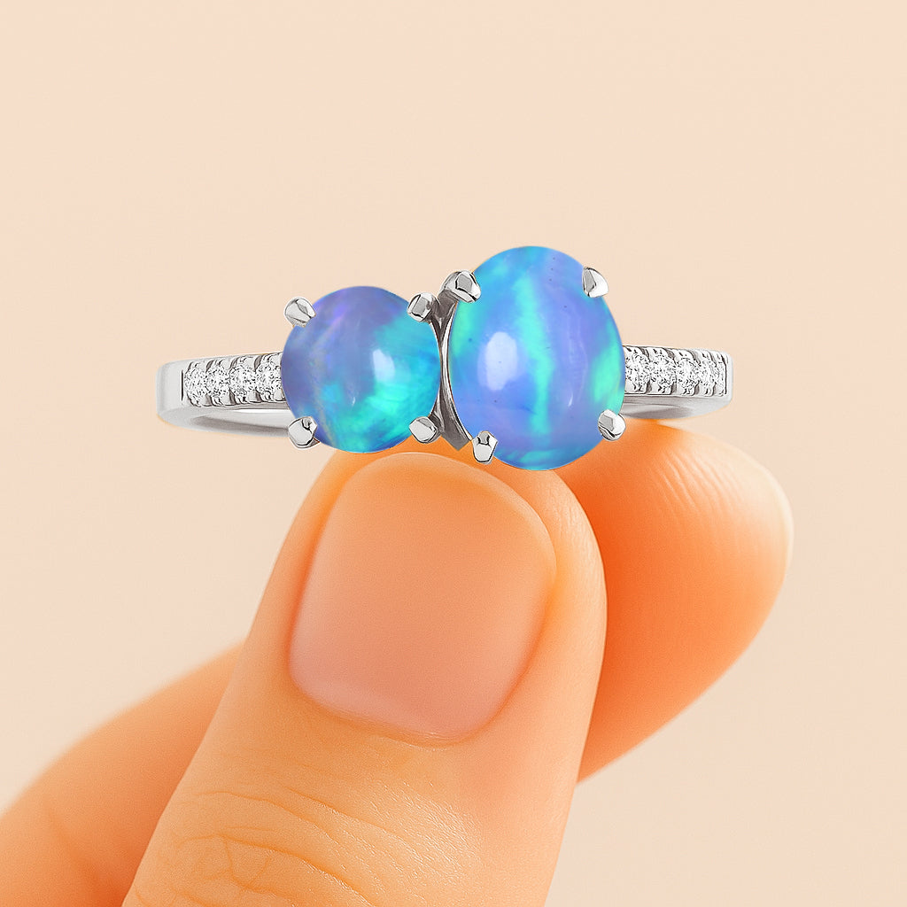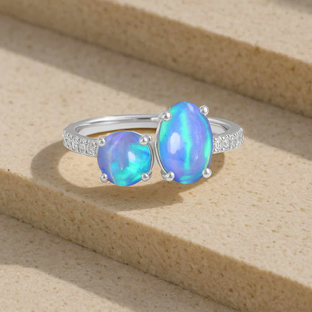 Blue OpalElevate your everyday elegance with this exquisite Blue Opal Two-Stone Ring, masterfully crafted in 925 sterling silver. Featuring a radiant 8x6 mm oval opal paired with a smooth 6 mm round opal, this 1.70 ct design highlights the gemstone’s soft iridescence and timeless charm. Its polished silver band and balanced silhouette create a refined, modern look suitable for any occasion. Weighing approximately 3.50 g, this opal ring adds a luxurious touch to your jewelry collection and makes a thoughtful gift for those who adore unique, meaningful gemstones.