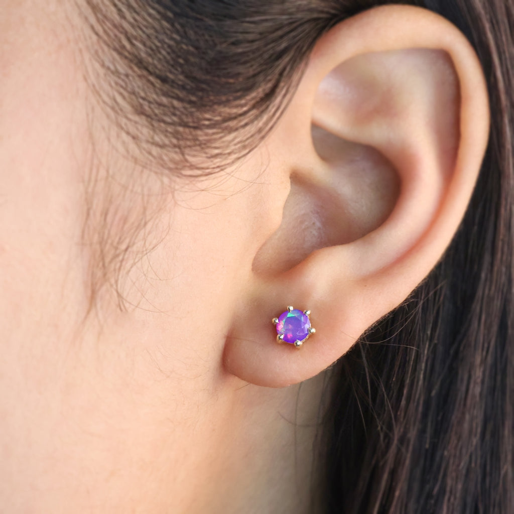 Lavender OpalIntroducing the Lavender Opal Stud Earrings! This beautiful earring features a round of stunning lavender opal gemstone. Wear it to add a touch of elegance and love to any outfit. Perfect for special occasions or everyday wear, this earring is sure to dazzle and delight.