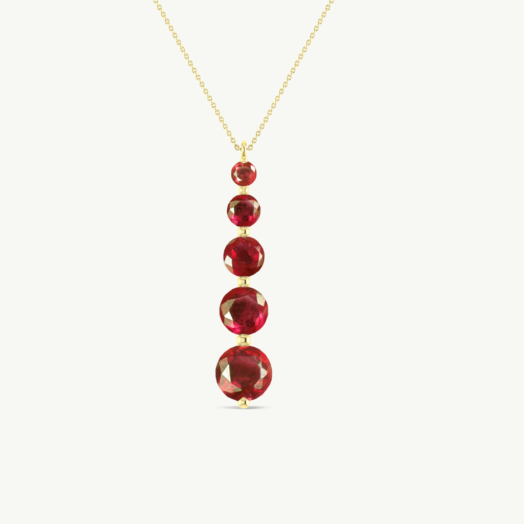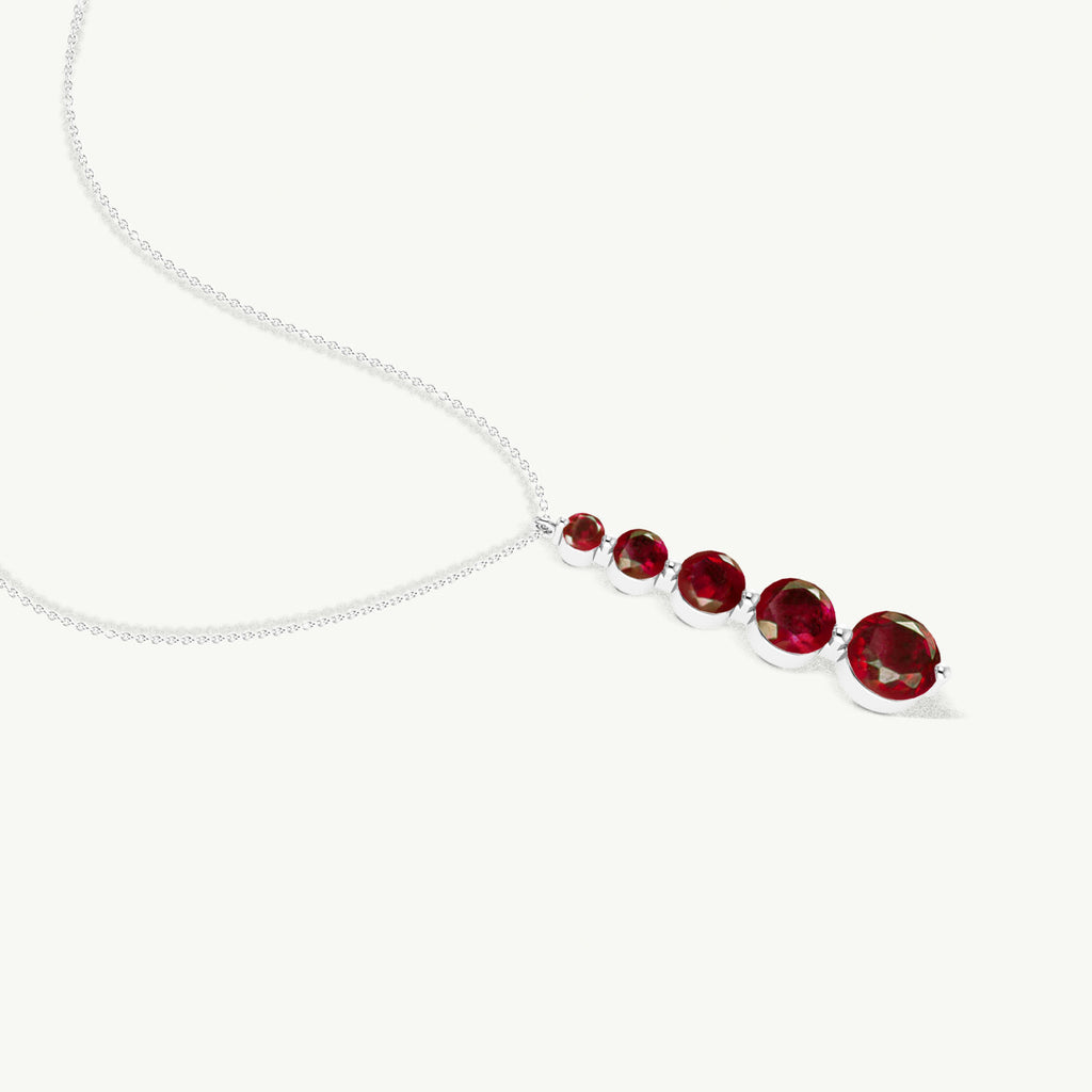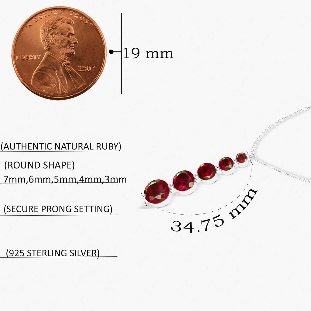 RubyThis Ruby 5-Stone Bar Pendant Necklace is crafted in genuine 925 Sterling Silver for a vibrant and elegant look. Featuring five round ruby stones ranging from 3mm to 7mm, it offers a total gemstone weight of 4 carats in a sleek vertical design. The pendant measures 34.75 × 7.30 mm and is paired with a 16” cable chain plus 2” extender, secured with a lobster clasp. Perfect for everyday elegance, special occasions, or gifting.