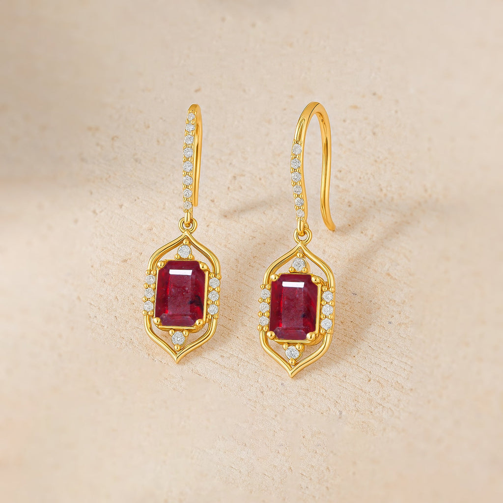 RubyElevate your style with these luxurious ruby drop earrings, beautifully crafted with 925 Sterling Silver for a rich and timeless shine. At the heart of each earring sits a radiant AAA red ruby gemstone in a 9x7mm octagon cut.