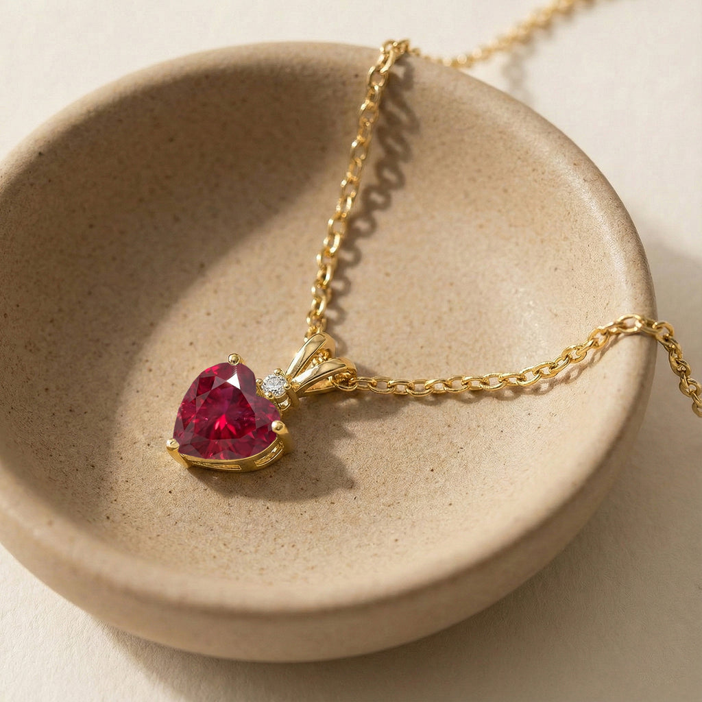 Add a touch of passion with this 1.5ct ruby heart pendant necklace. Featuring a 7mm faceted ruby set in yellow gold plated brass, the 12.5x7mm heart charm hangs gracefully on a 16"+2" adjustable cable chain. Lightweight at approximately 3.5g, it’s perfect for everyday wear or special occasions. This stunning ruby jewelry piece makes a thoughtful gift and adds vibrant elegance to any outfit.