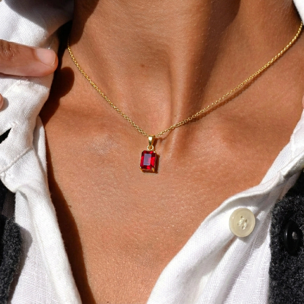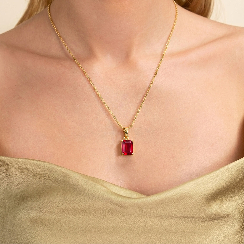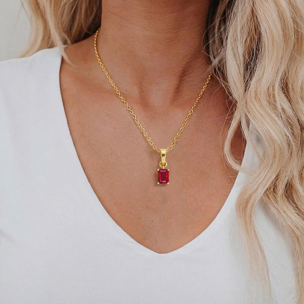 Make a bold statement with this Ruby Octagon Solitaire Pendant Necklace. Featuring a faceted 9x7 mm octagon-shaped ruby (approx. 1.4 carats), this striking pendant is crafted in yellow gold plated brass for a polished, radiant finish. Measuring 17.70 x 7 mm, it hangs elegantly from a 16” + 2” adjustable cable chain with a secure lobster clasp. Perfect for adding sophistication to everyday wear or as a thoughtful gift for someone special.